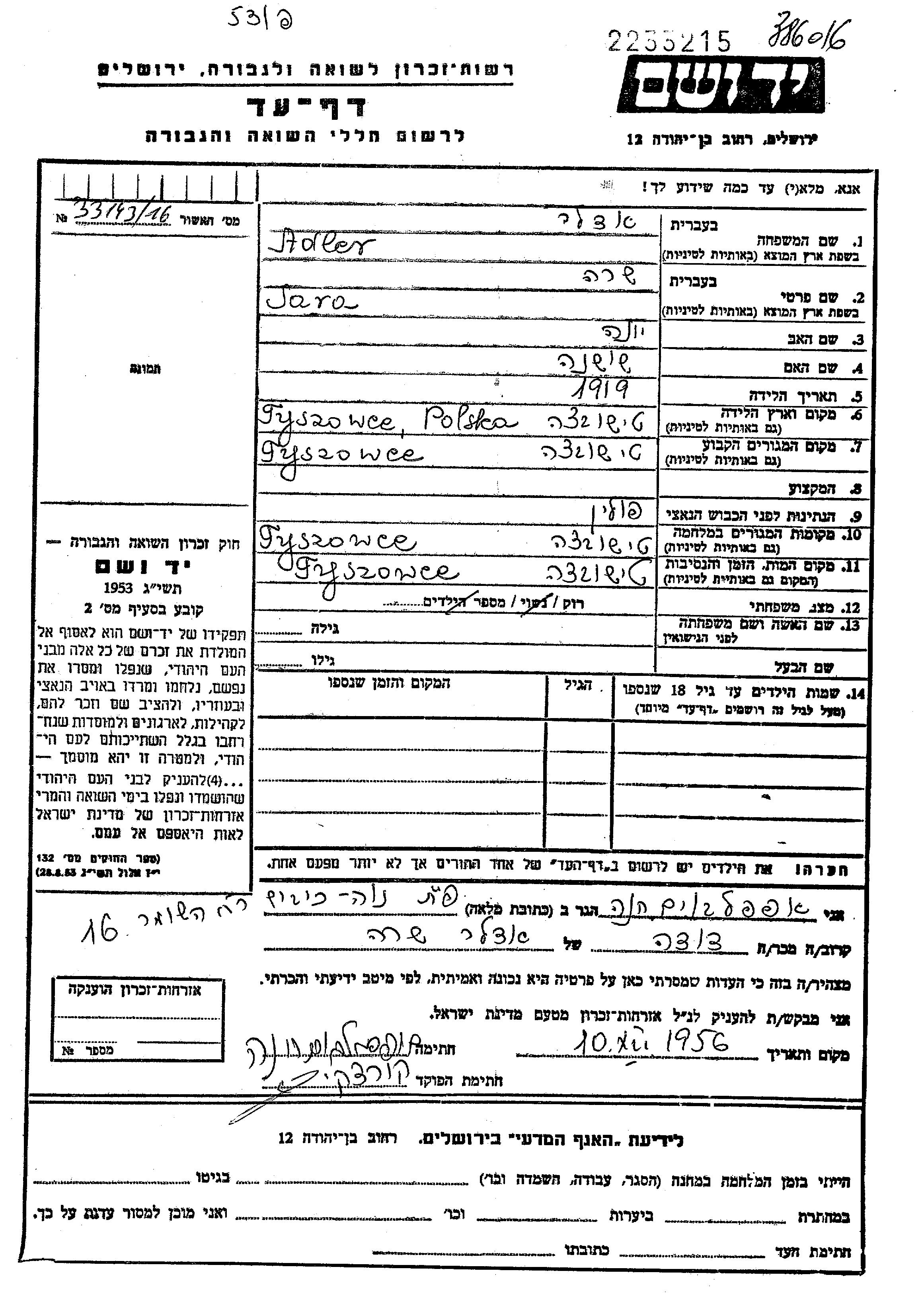 Сара Адлер, место рождения: Тышовце, Польша. Отец: Иона, mать:Шошана, девичья фамилия Руб. Холост / не замужем. Место жительства до войны: Тышовце, Польша. Место во время войны: Тышовце, Польша.