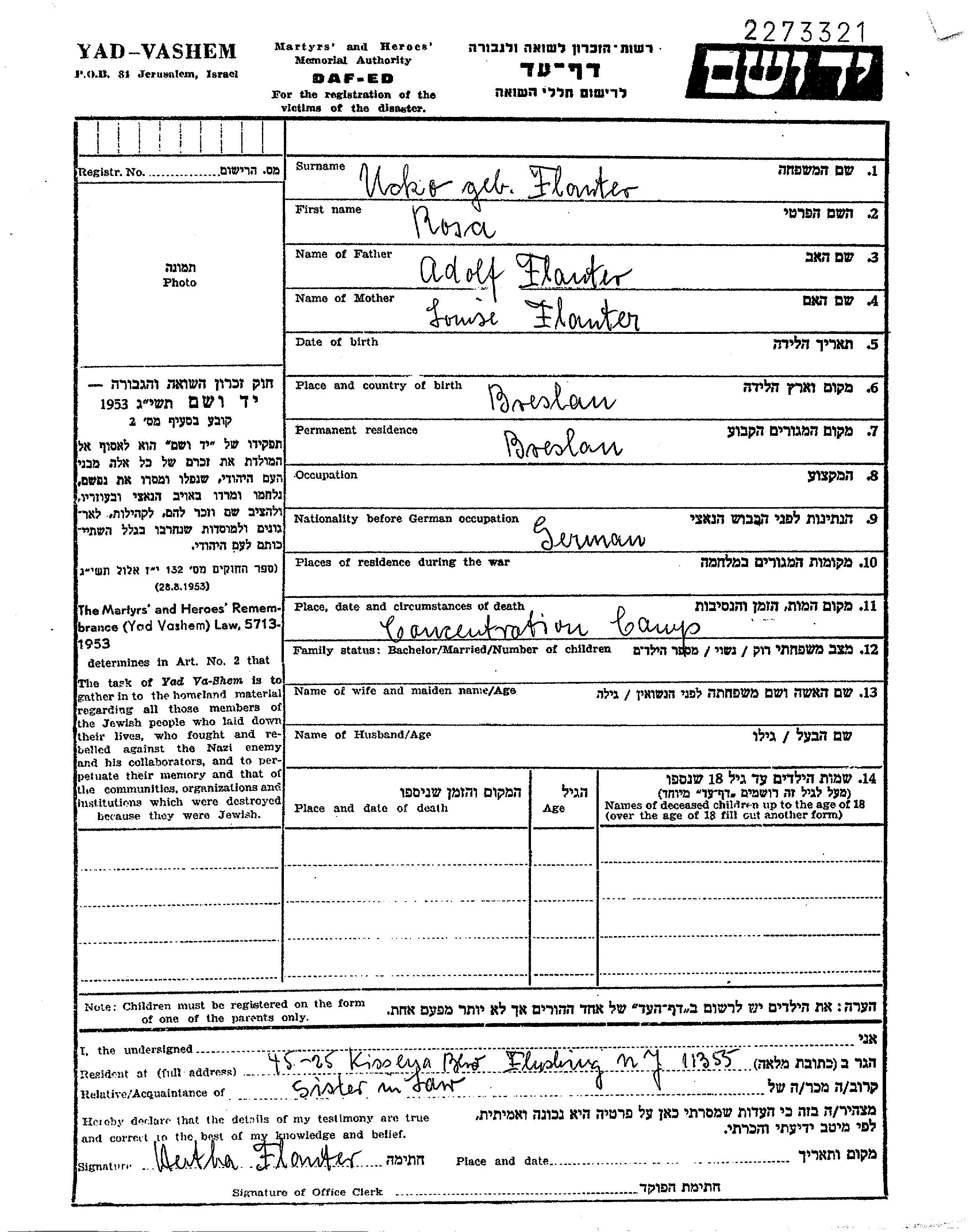Укко Роза Бреслау, Германия Лист свидетельских показаний
