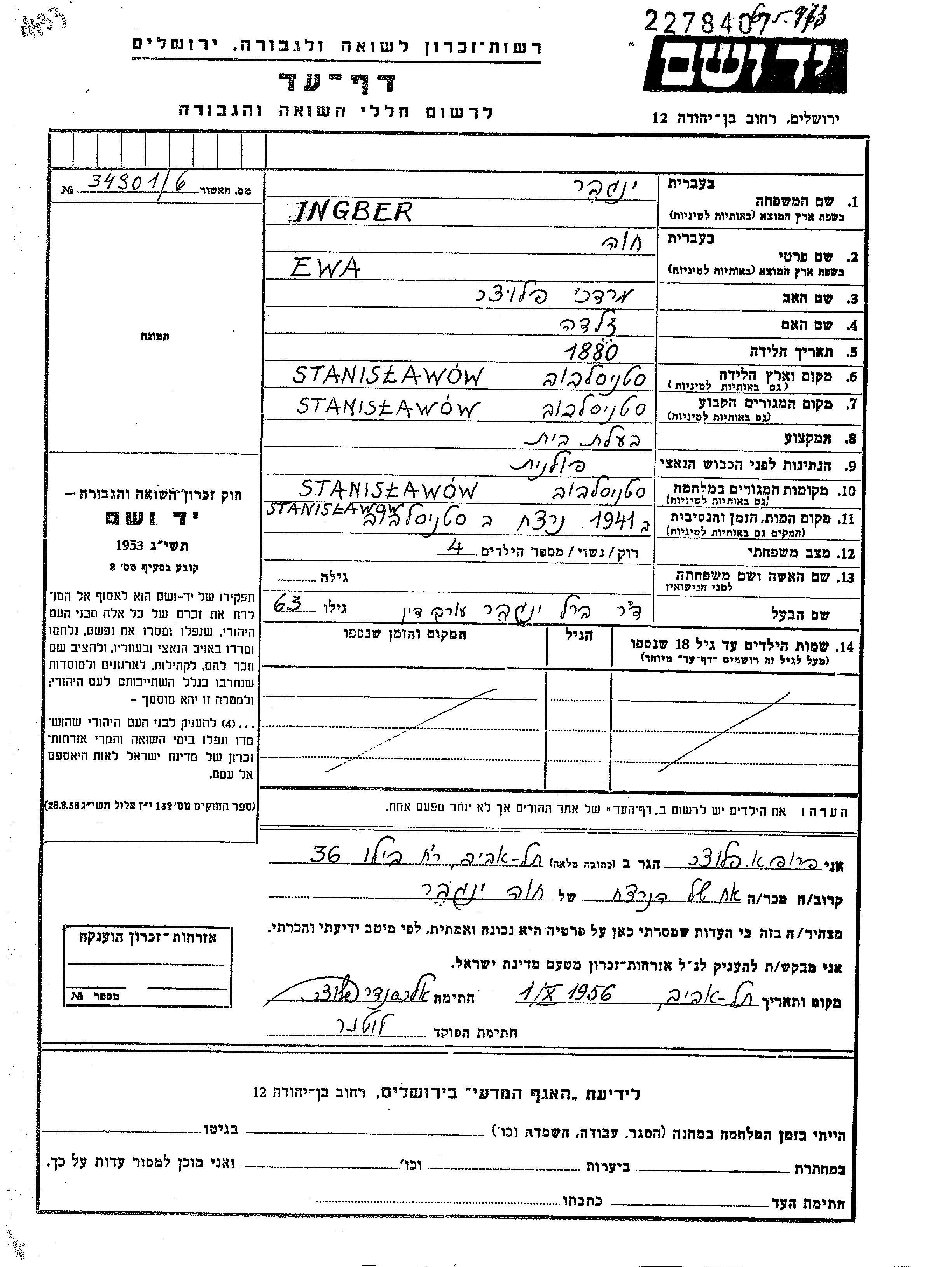 Эва Хава Ингбер, девичья фамилия Плуцер, место рождения: Станиславув, Польша. Отец: Мордехай, mать:Зельда. Домохозяйка. Женат / замужем. Место жительства до войны: Станиславув, Польша. Место во время войны: Станиславув, Польша.