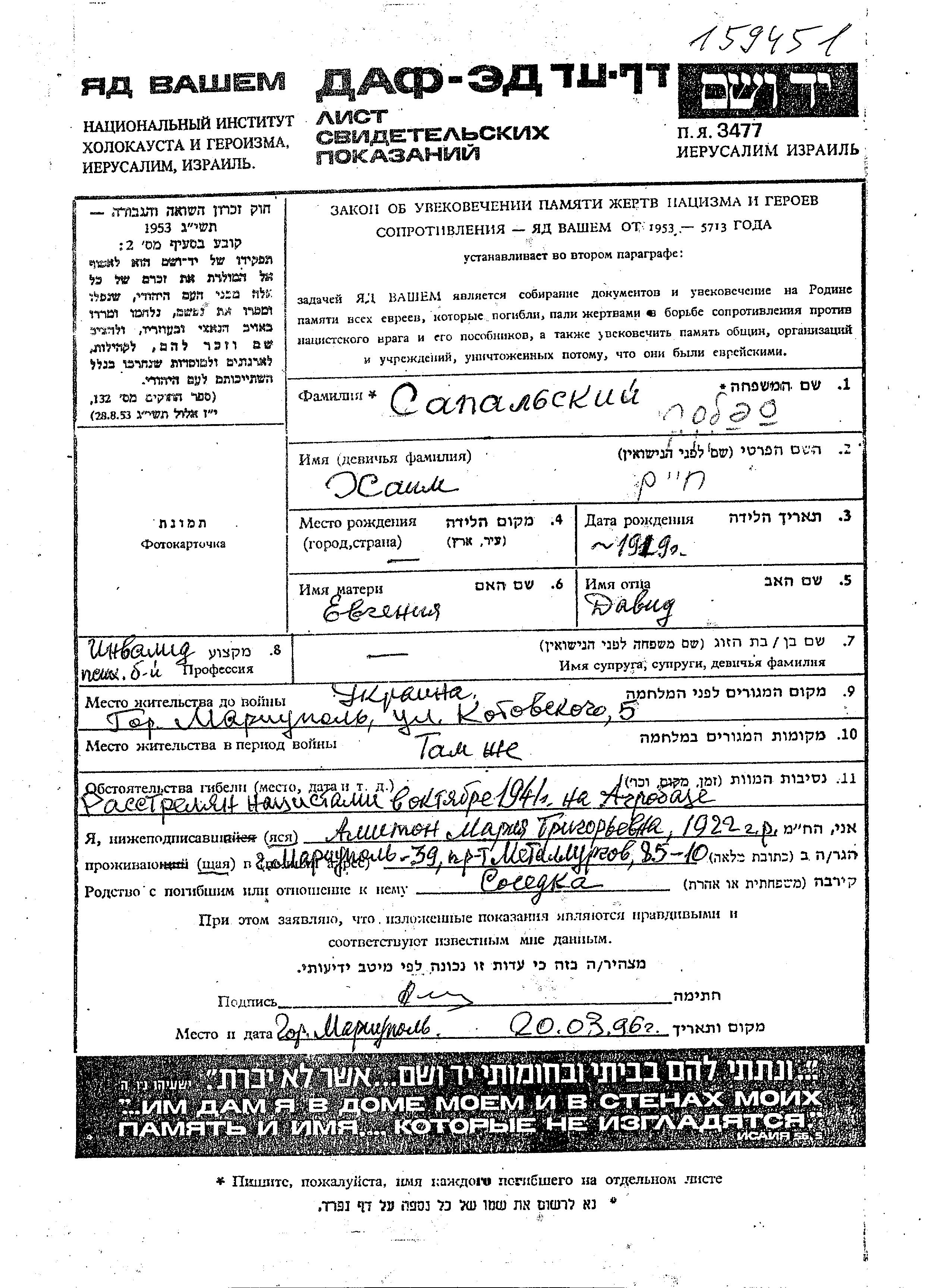 Сапальский Хаим 1919 Мариуполь, Украина (СССР) Лист свидетельских показаний