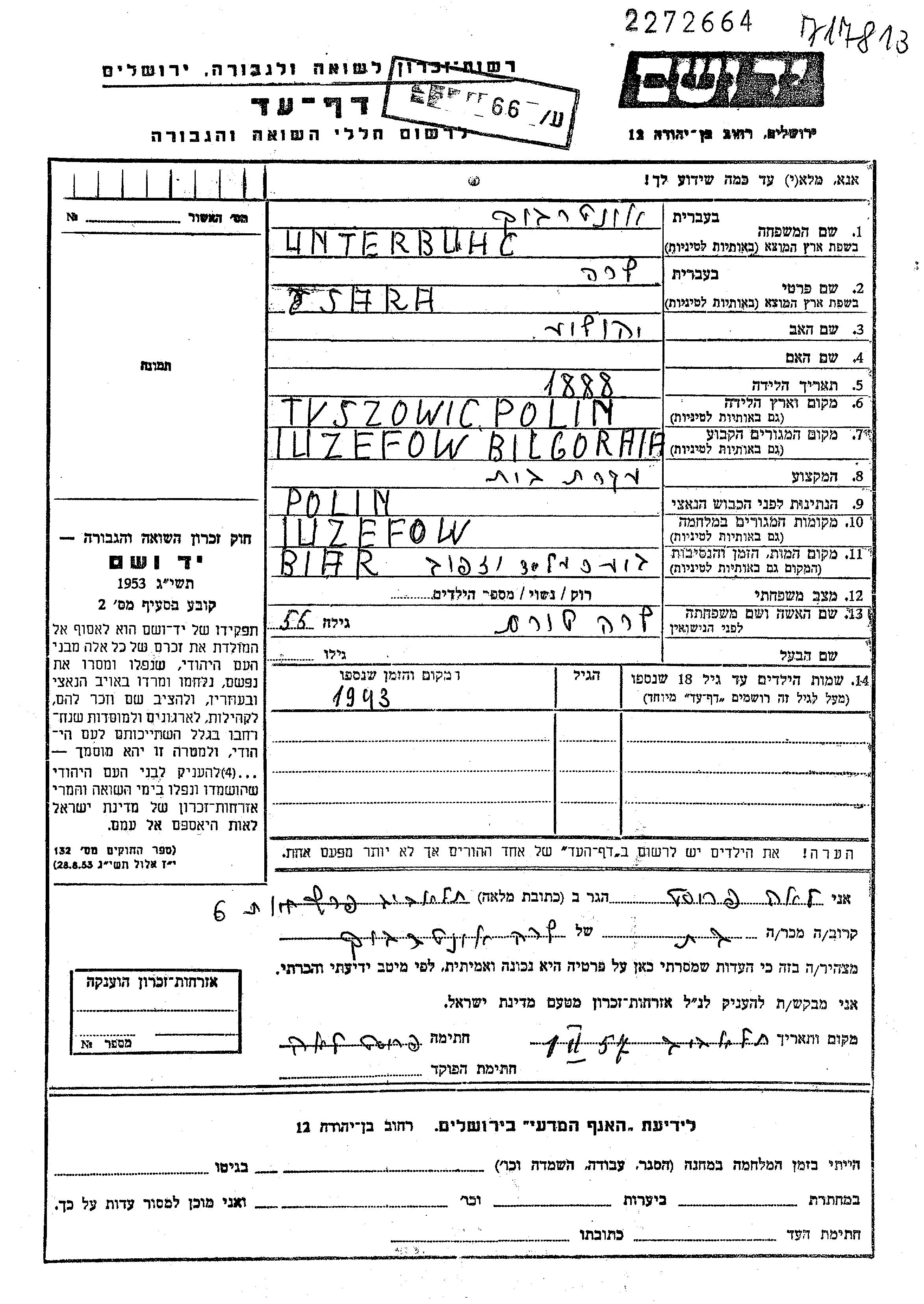 Сара Унтербух, девичья фамилия Турм, место рождения: Тышовце, Польша. Отец: Иегошуа. Домохозяйка. Женат / замужем. Место жительства до войны: Юзефув, Польша. Место во время войны: Юзефув, Польша.