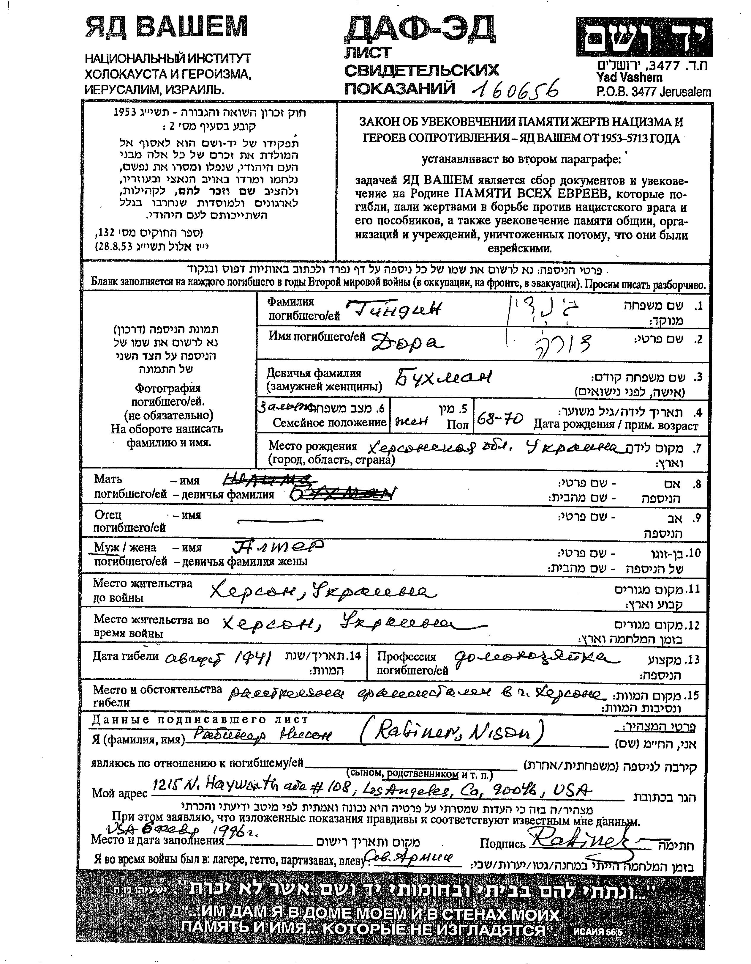 Дора Гиндин, девичья фамилия Бухман, место рождения: Херсон, Украина (СССР). Домохозяйка. Женат / замужем. Место жительства до войны: Херсон, Украина (СССР). Место во время войны: Херсон, Украина (СССР).