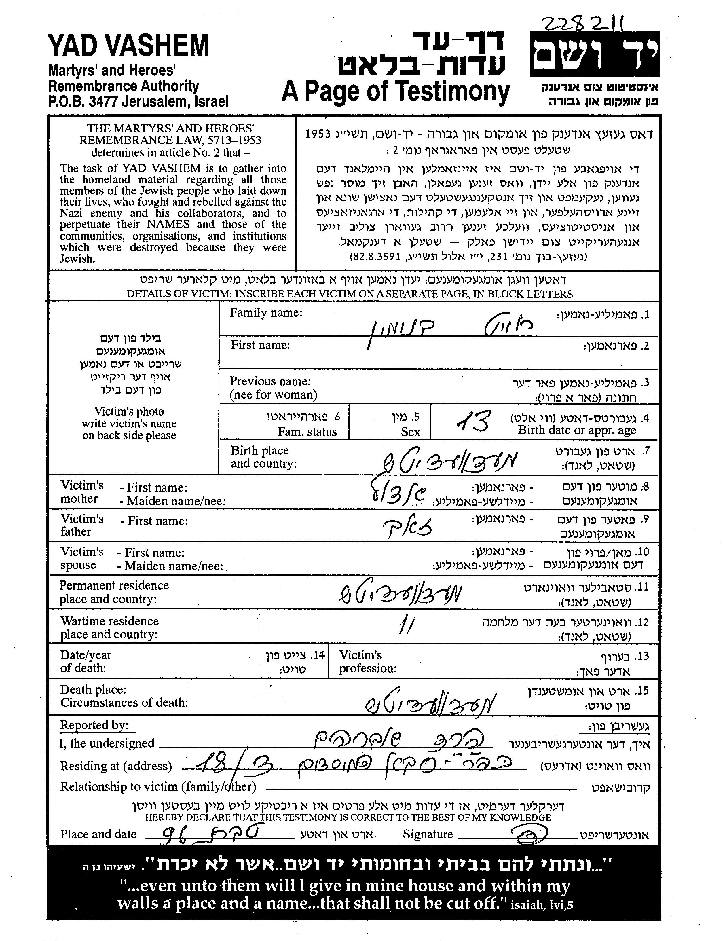 Яд Вашем - Листы свидетельских показаний Мемориального фонда