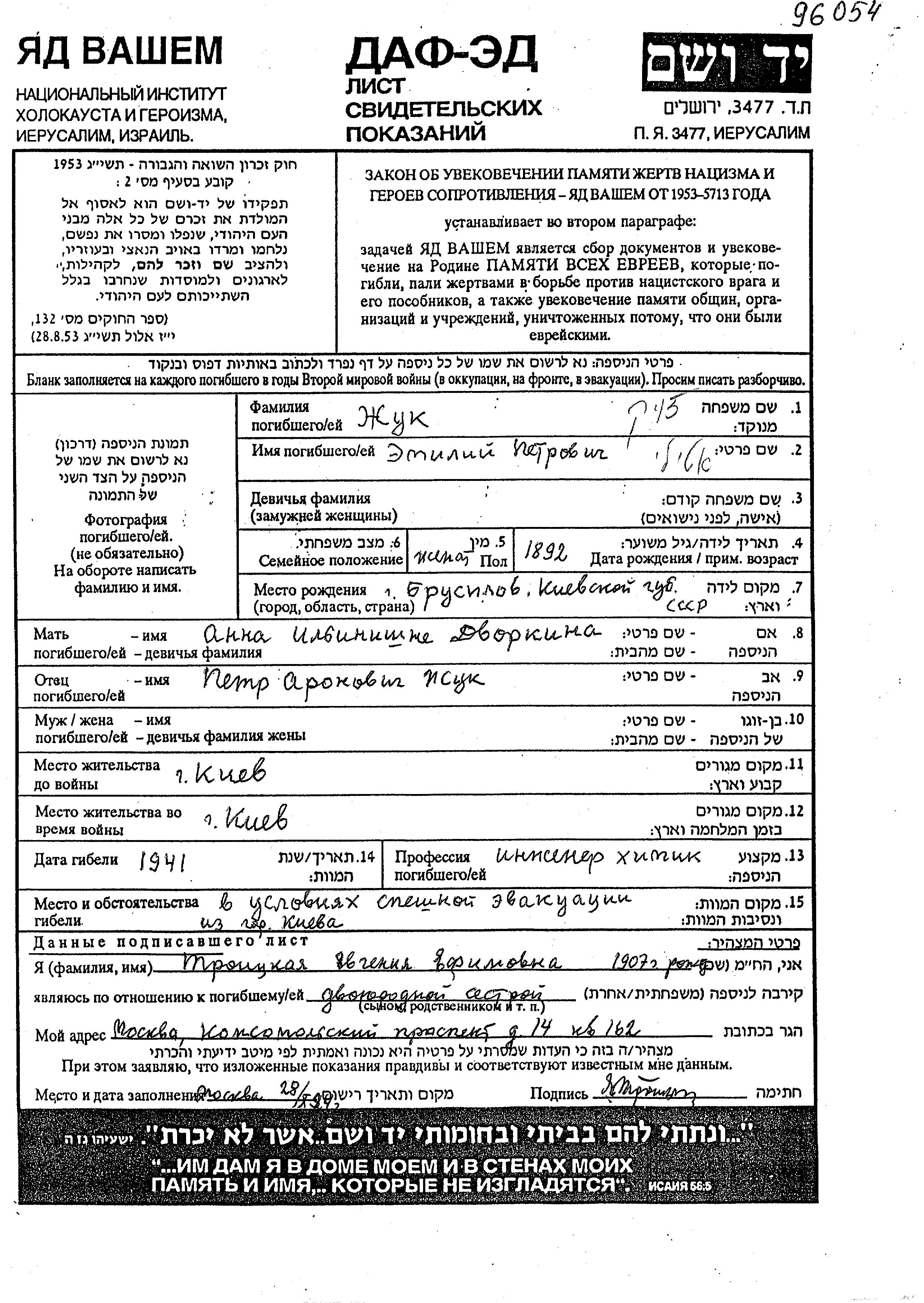 Жук Эмили 1892 Киев, Украина (СССР) Лист свидетельских показаний
