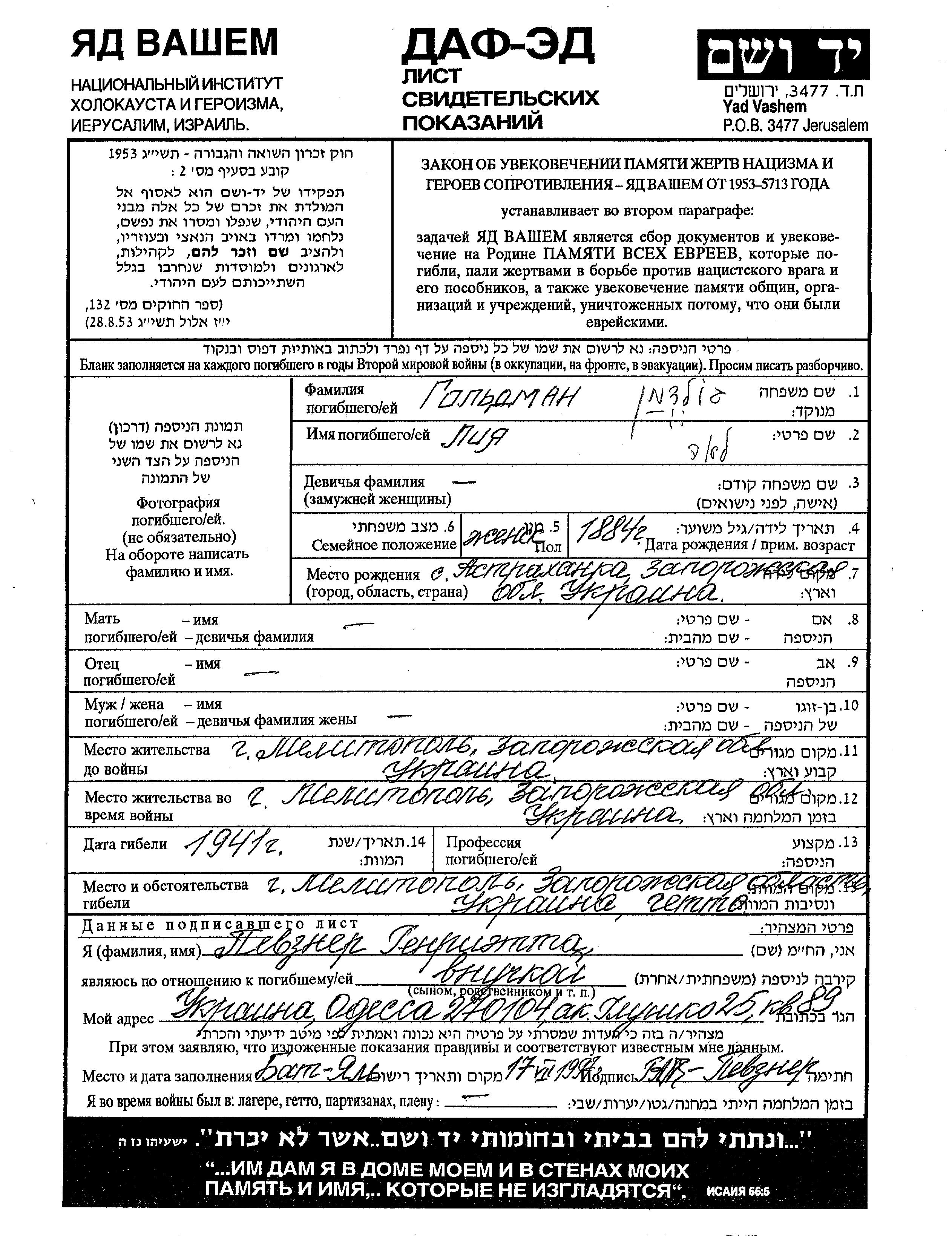 Гольдман Лия 1884 Мелитополь, Украина (СССР) Лист свидетельских показаний