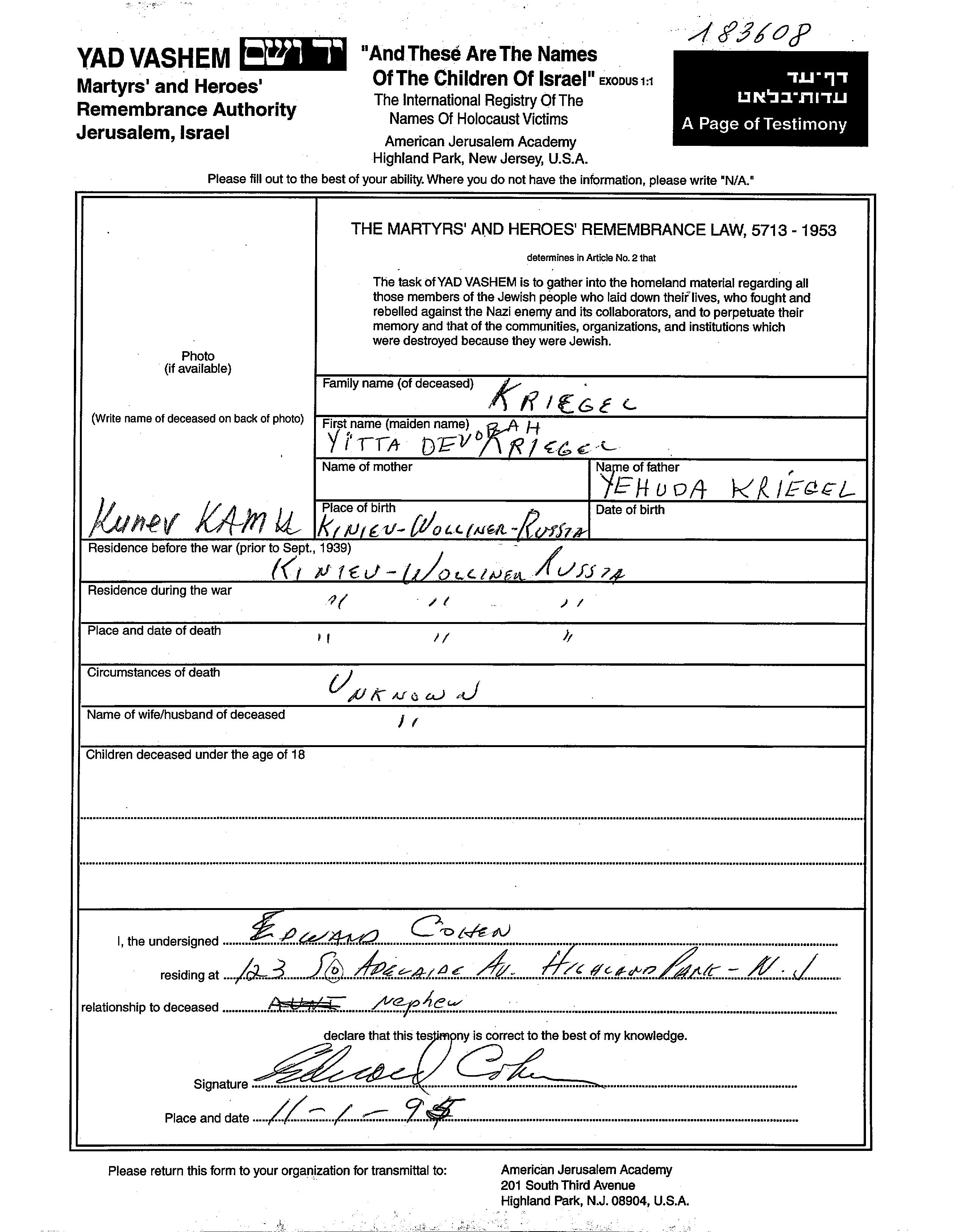 Итта Девора Кригель, девичья фамилия Кригель, место рождения: Кунев, Украина (СССР). Отец: Иегуда. Место жительства до войны: Кунев, Украина (СССР). Место во время войны: Кунев, Украина (СССР).