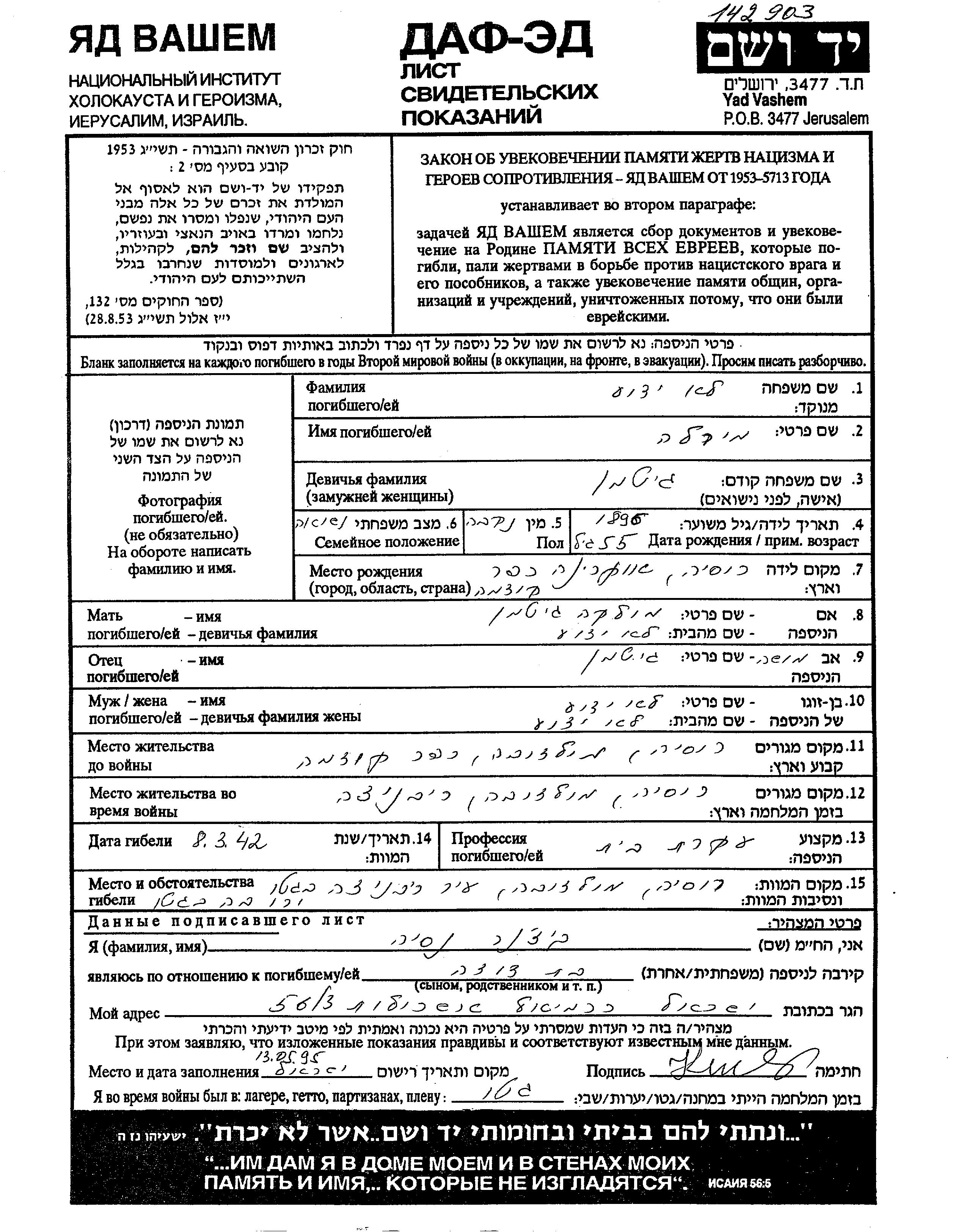 Яд Вашем - Листы свидетельских показаний Мемориального фонда