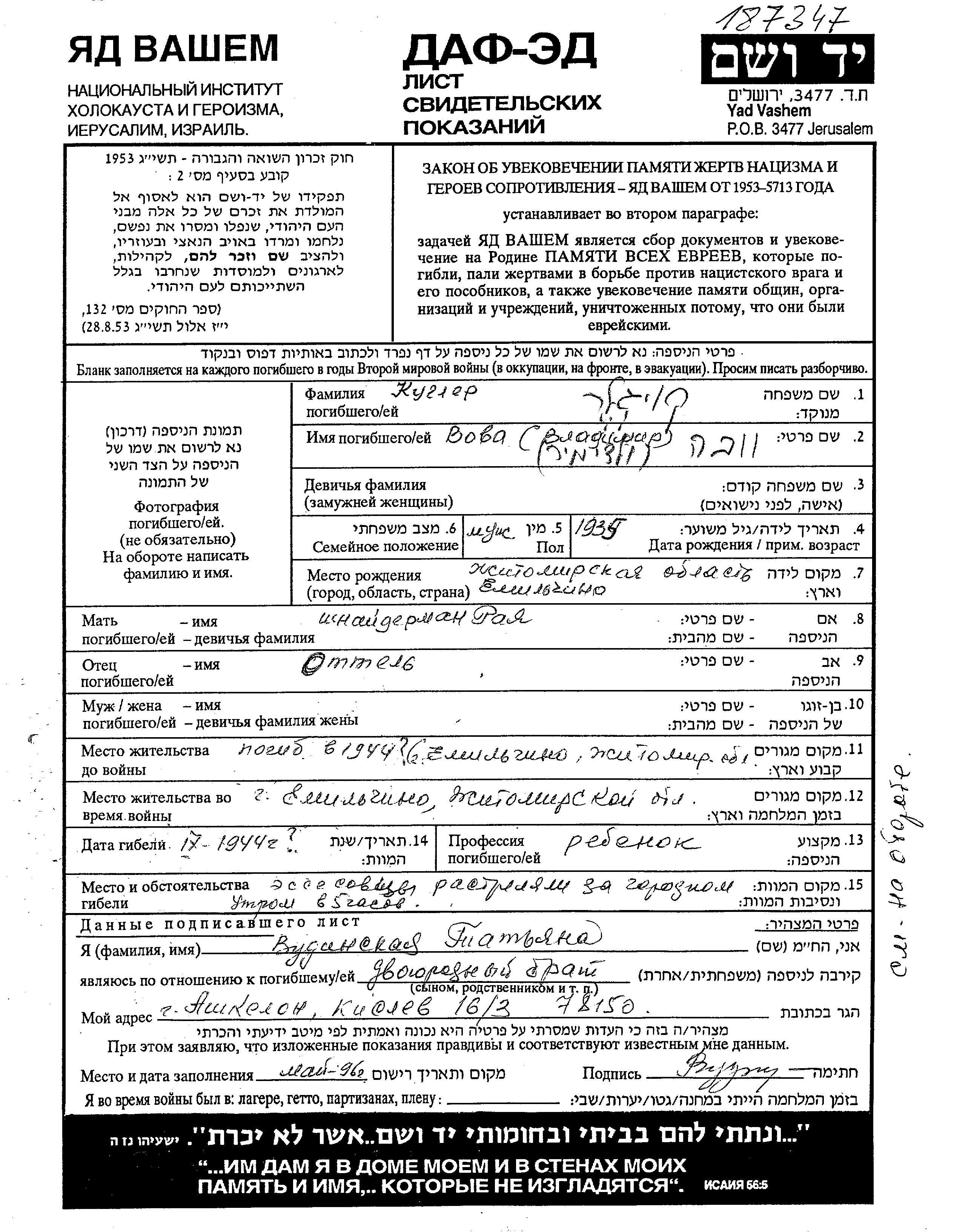 Куглер Вова 1935 Емильчино, Украина (СССР) Лист свидетельских показаний