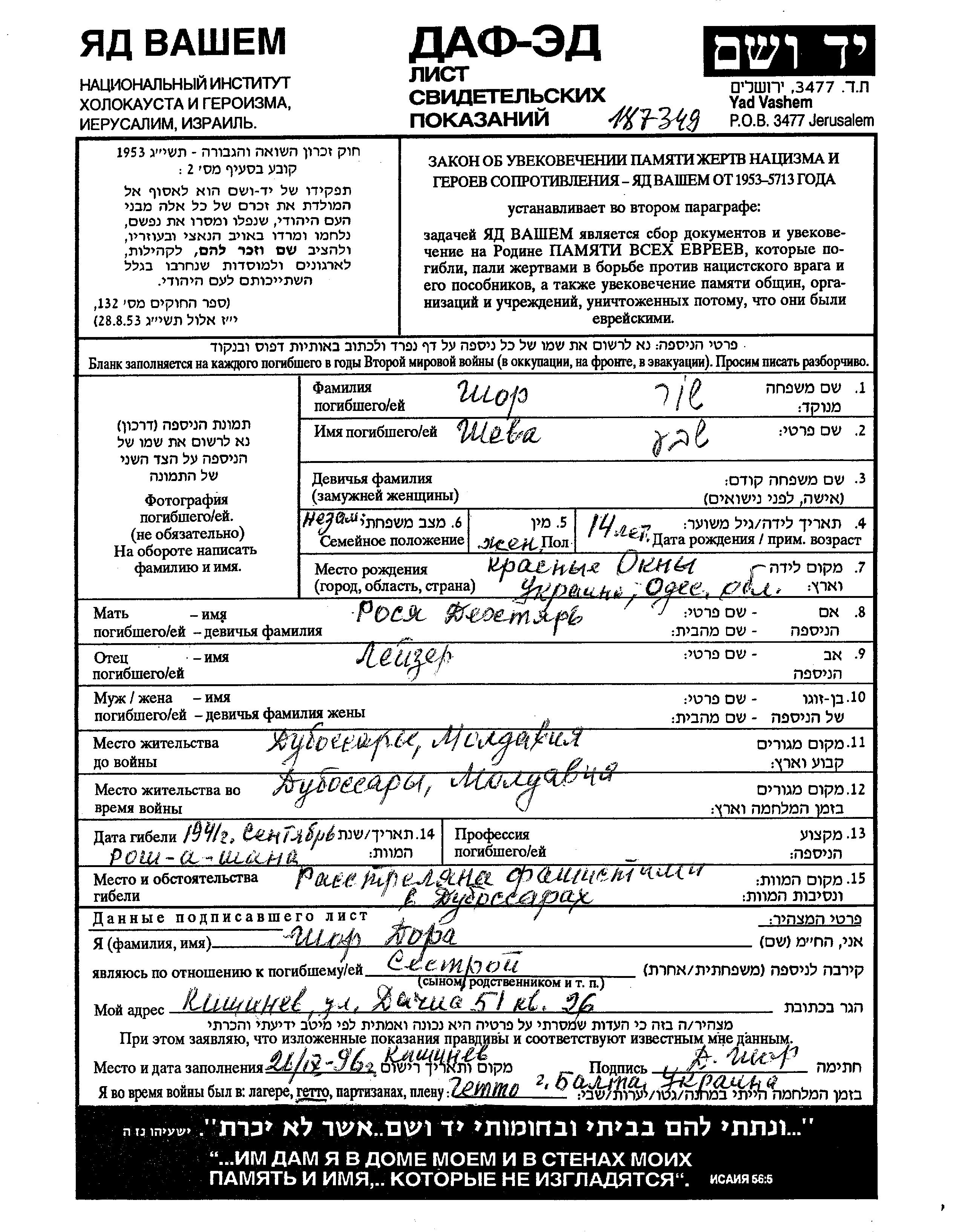 Яд Вашем - Листы свидетельских показаний Мемориального фонда