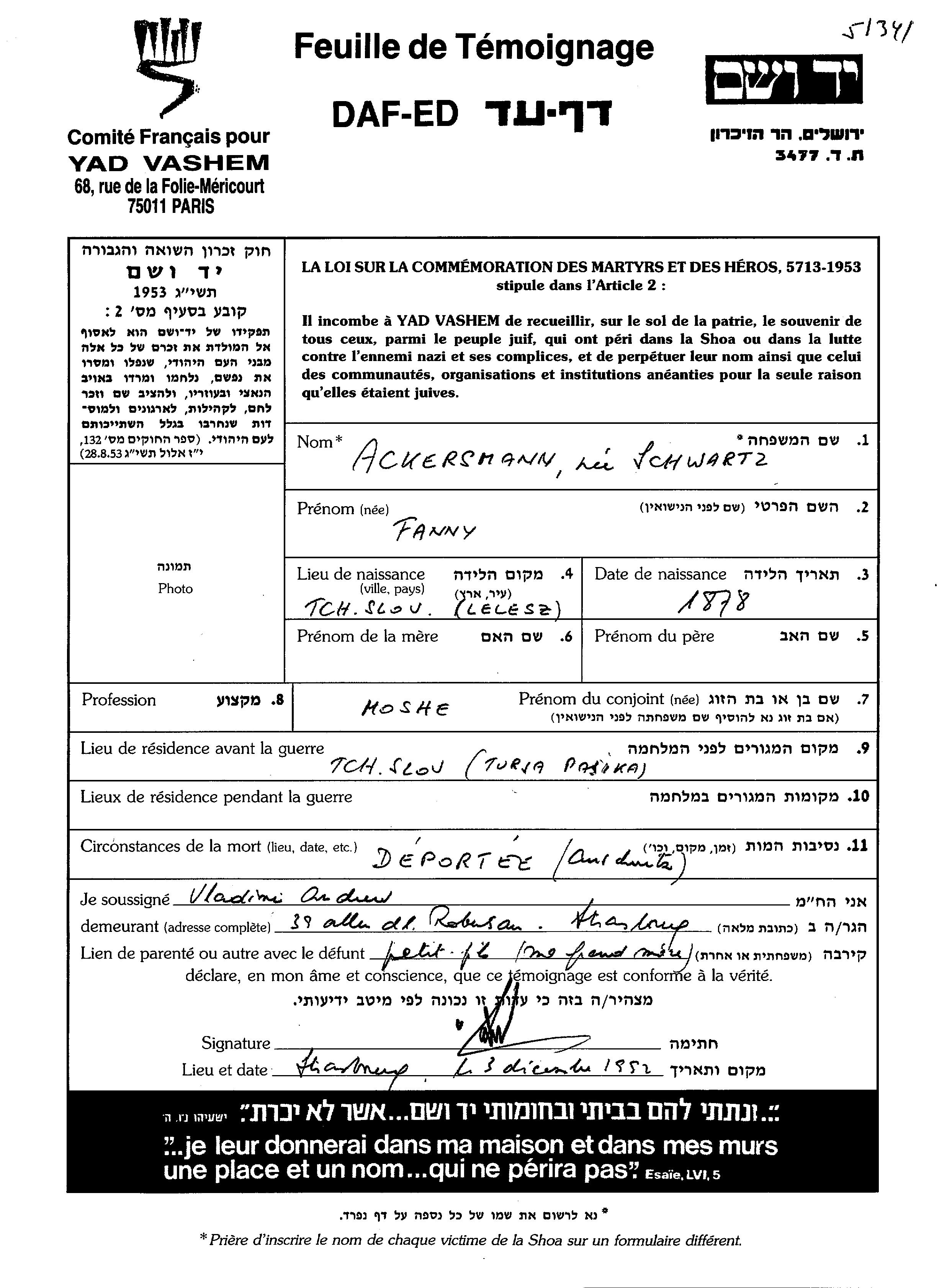 Фанни Акерсман, девичья фамилия Шварц, место рождения: Лелес, Чехословакия. Женат / замужем. Место жительства до войны: Турья Пасика, Чехословакия.