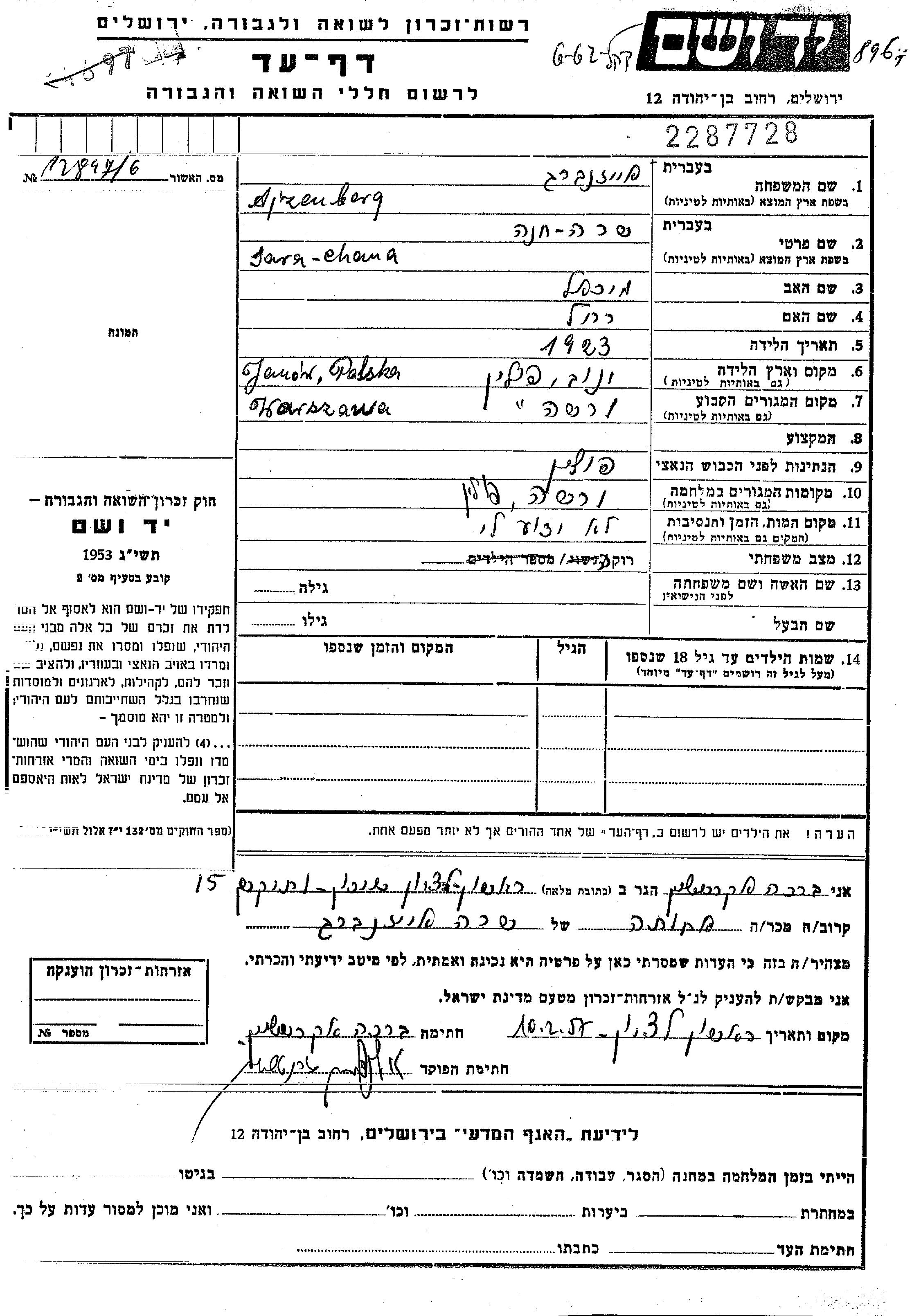 Хана Сара Айзенберг, место рождения: Янув, Польша. Отец: Михаэль, mать:Рахель. Холост / не замужем. Место жительства до войны: Варшава, Польша. Место во время войны: Варшава, Польша.