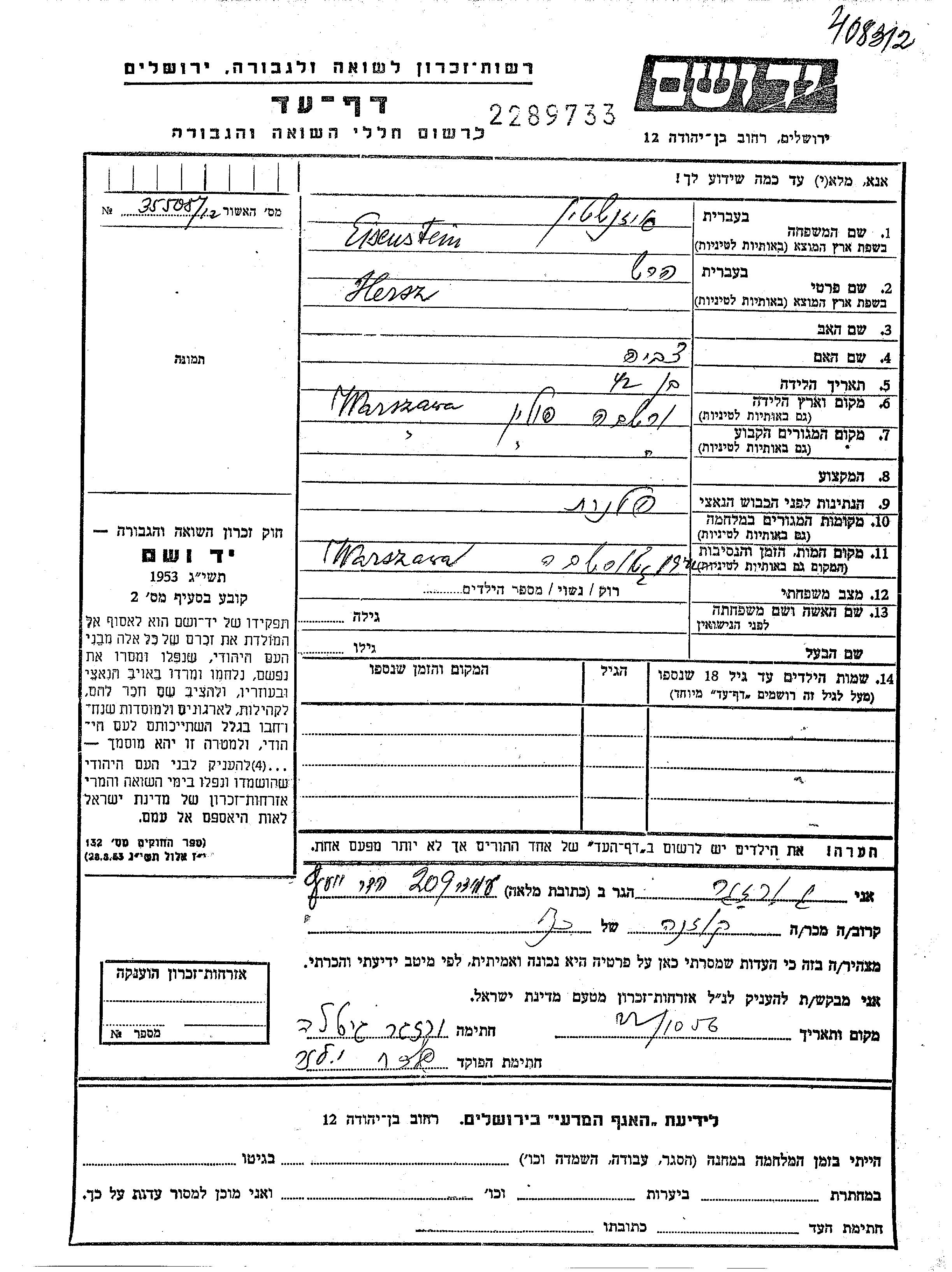 Герш Айзенштайн, место рождения: Варшава, Польша.Mать:Цивие. Место жительства до войны: Варшава, Польша. Место во время войны: Польша.