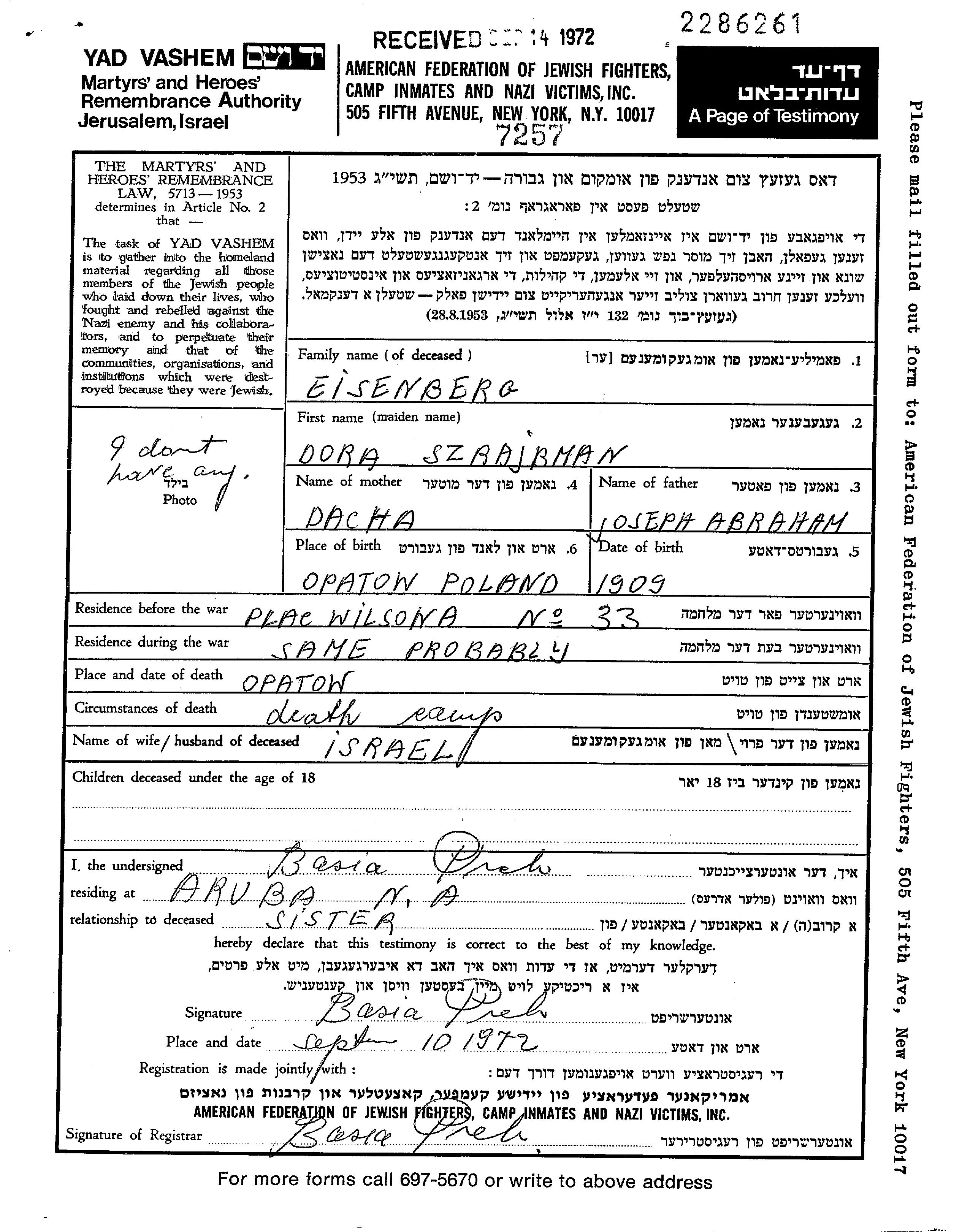 Айзенберг Дора 1909 Опатув, Польша Лист свидетельских показаний