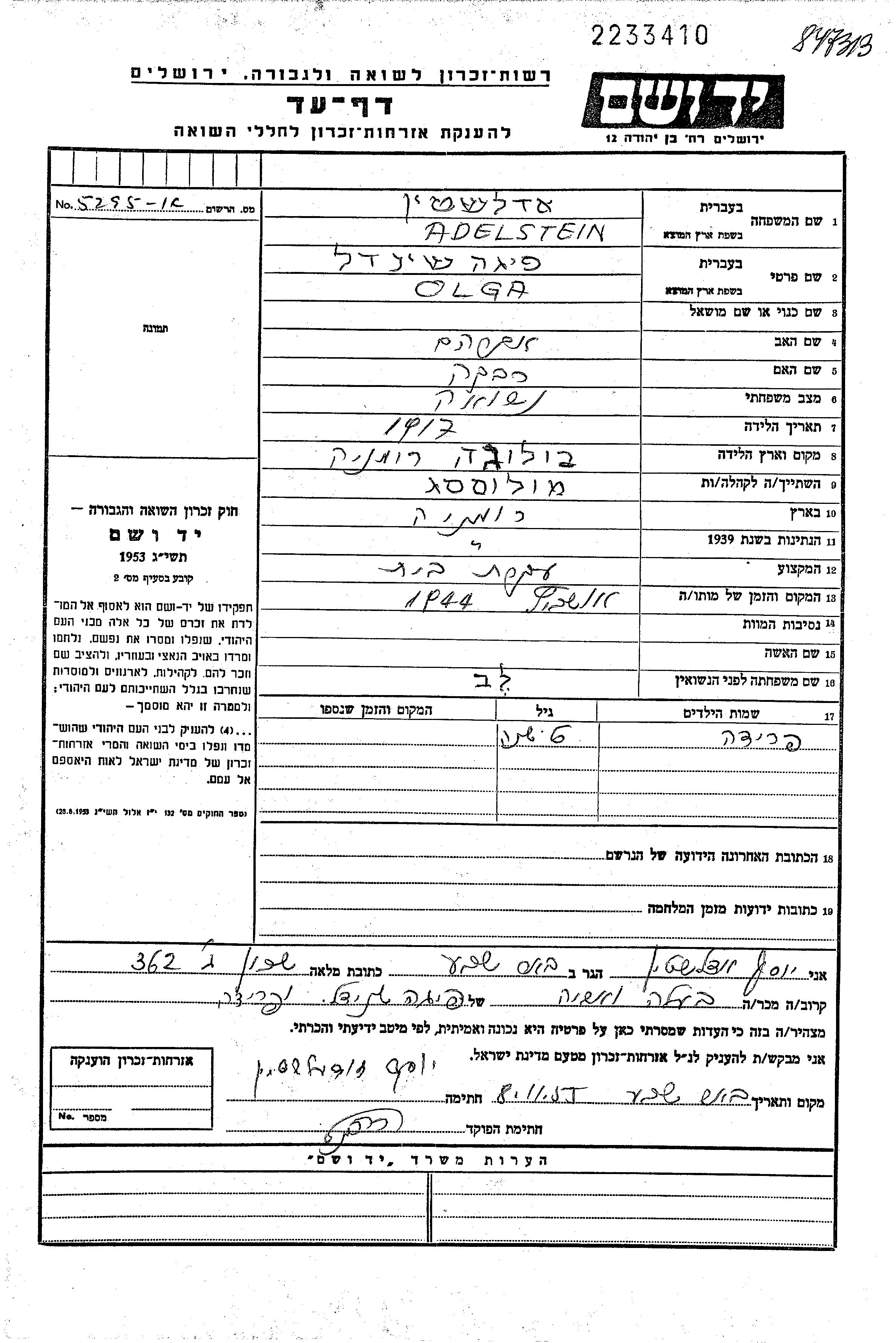 Адельштайн Шейндель Фейга Ольга 1917 Маломсег, Румыния Лист свидетельских показаний