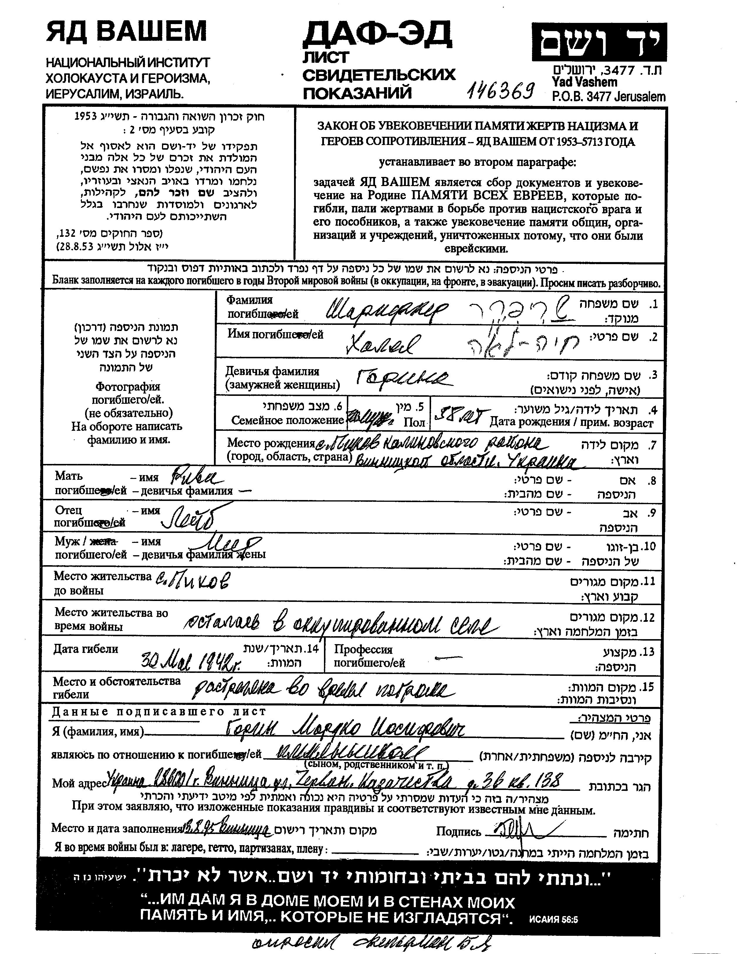 Яд Вашем - Листы свидетельских показаний Мемориального фонда