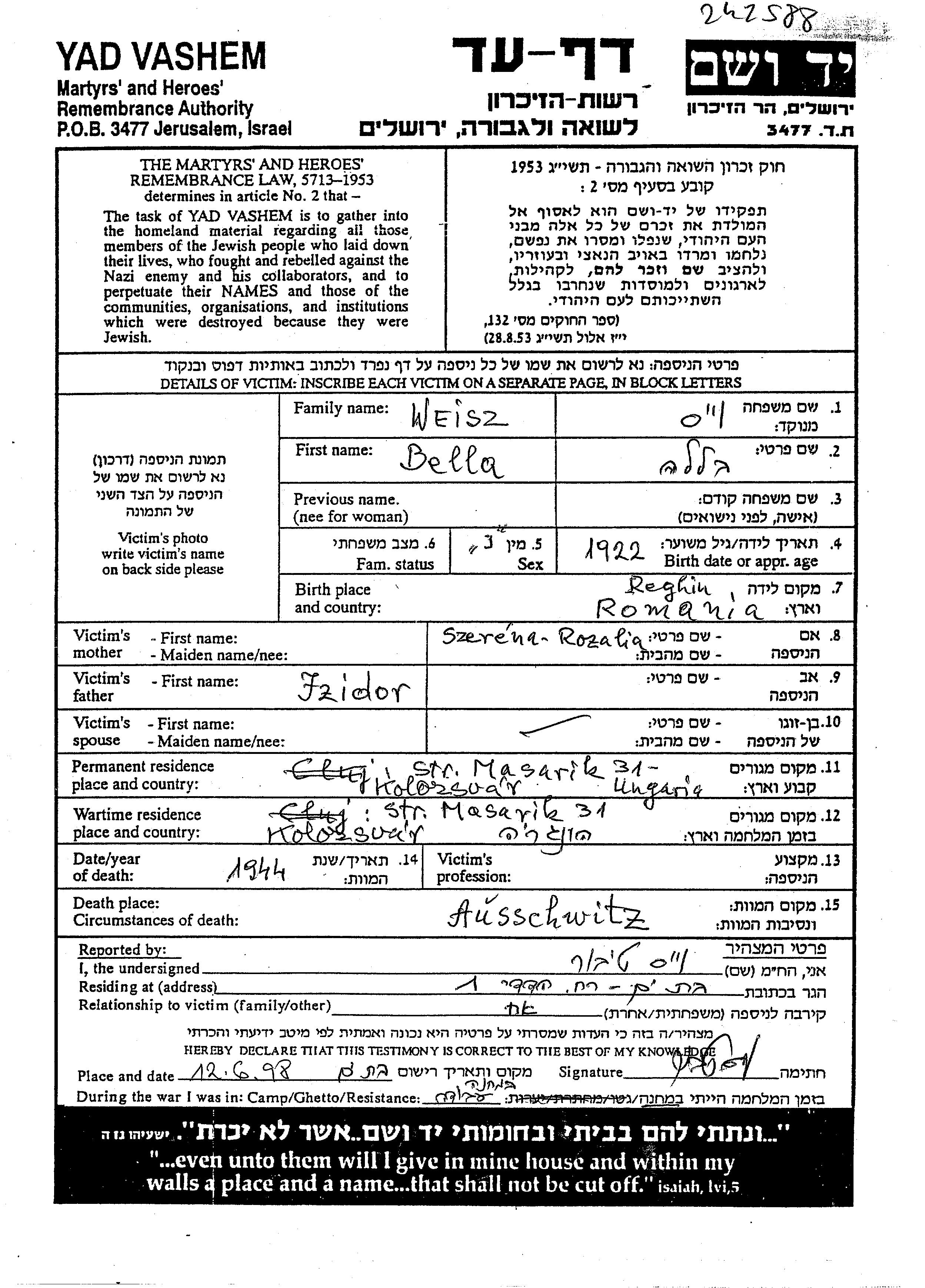 Белла Вейс, место рождения: Регин, Румыния. Отец: Изидор, mать:Серена Розалия, девичья фамилия Клейн. Место жительства до войны: Коложвар, Румыния. Место во время войны: Коложвар, Румыния.