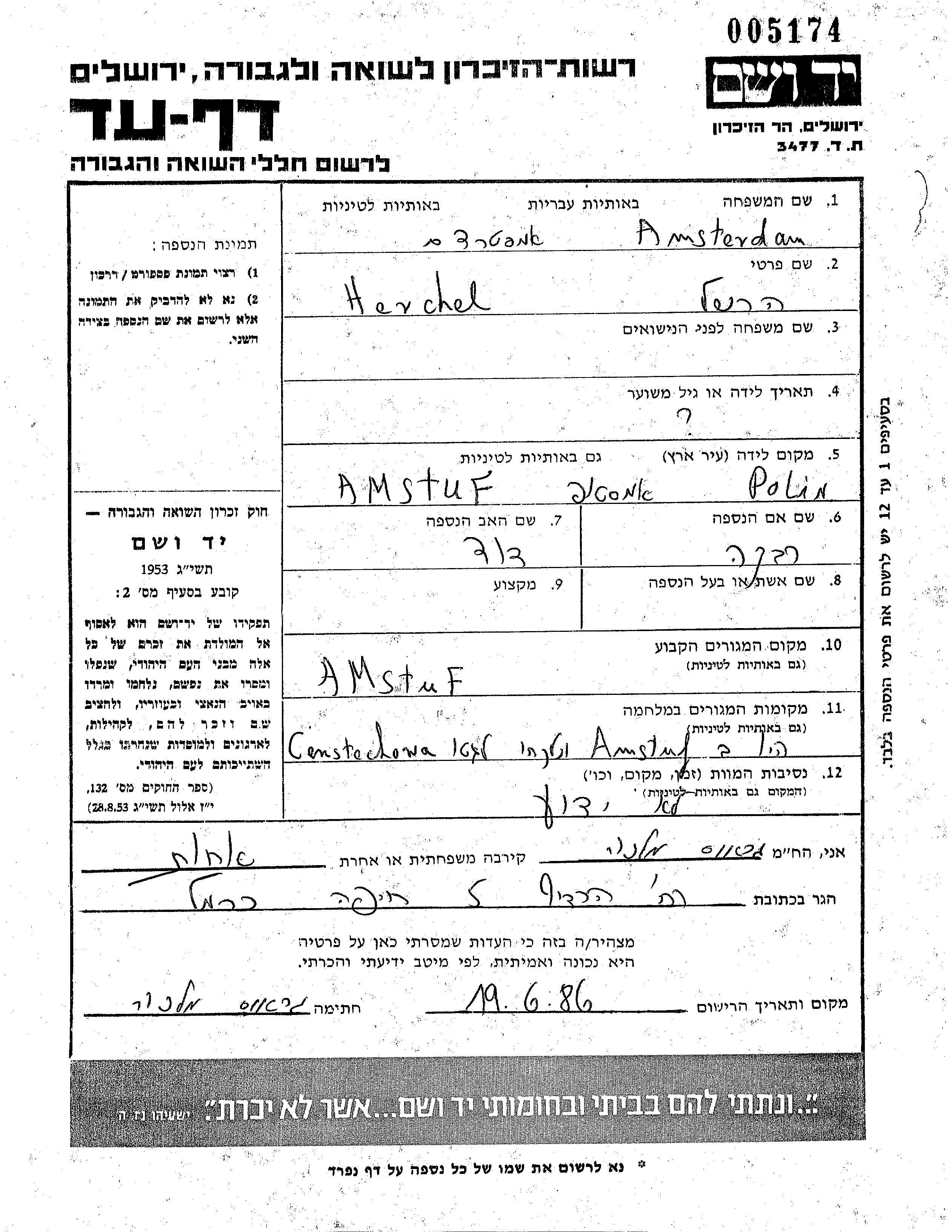 Гершель Амстердам, место рождения: Омстов, Польша. Отец: Давид, mать:Ривка, девичья фамилия Зальковиц. Место жительства до войны: Омстов, Польша. Место во время войны: Ченстохова, Польша.