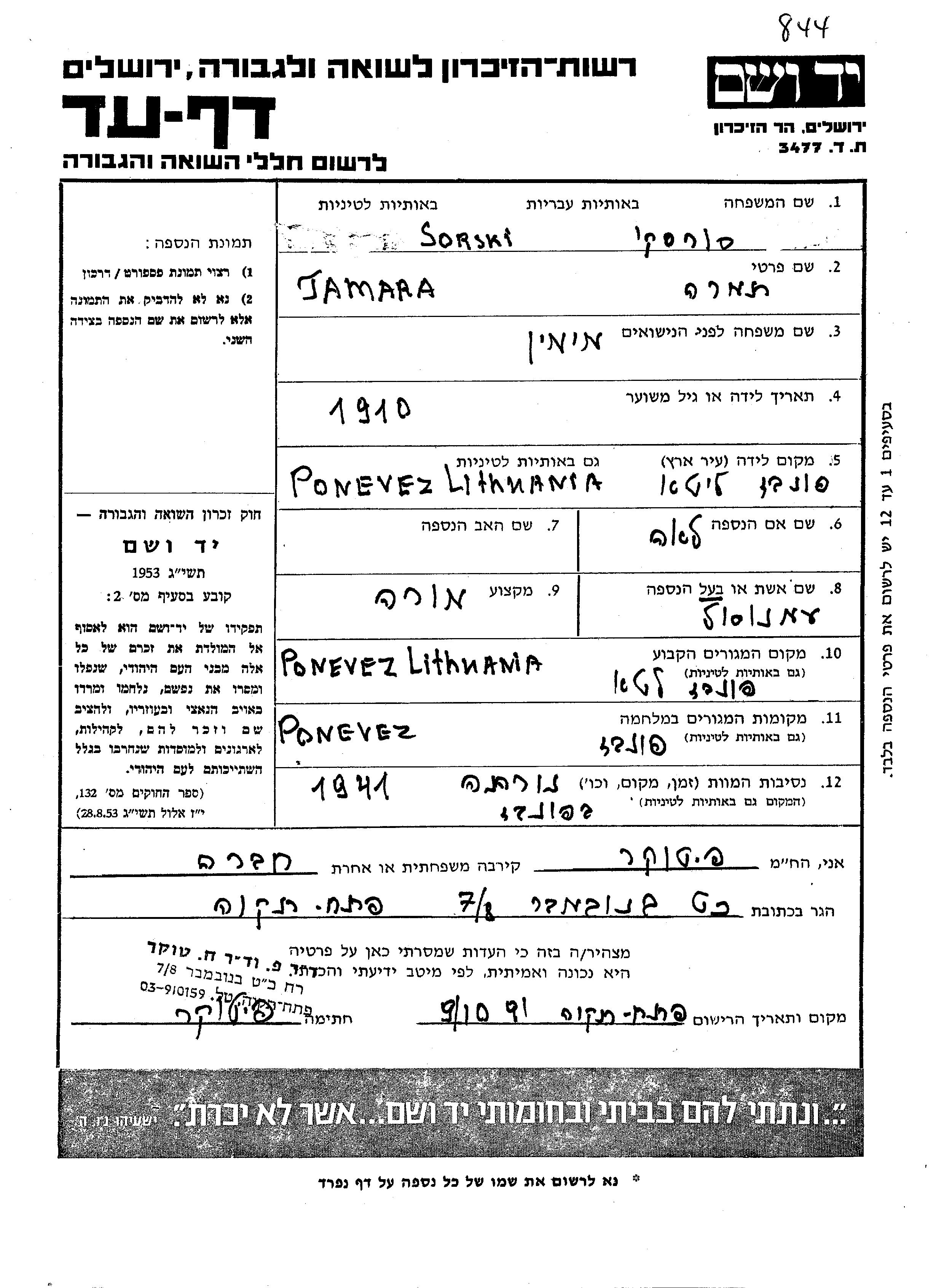 Сорски Тамара 1910 Паневежис, Литва Лист свидетельских показаний