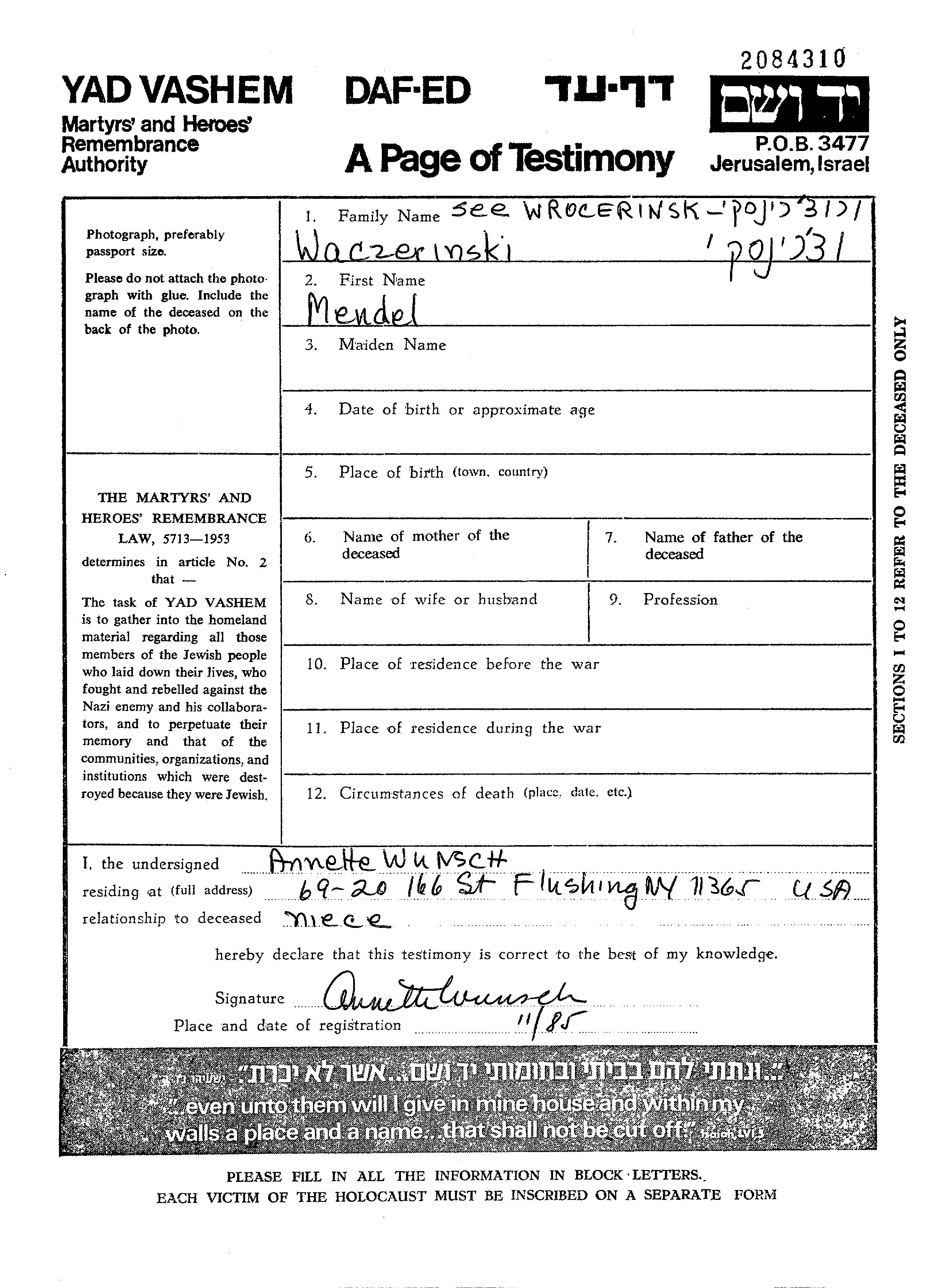 Вачерински Врочеринский Мендель место не указано, Лист свидетельских показаний