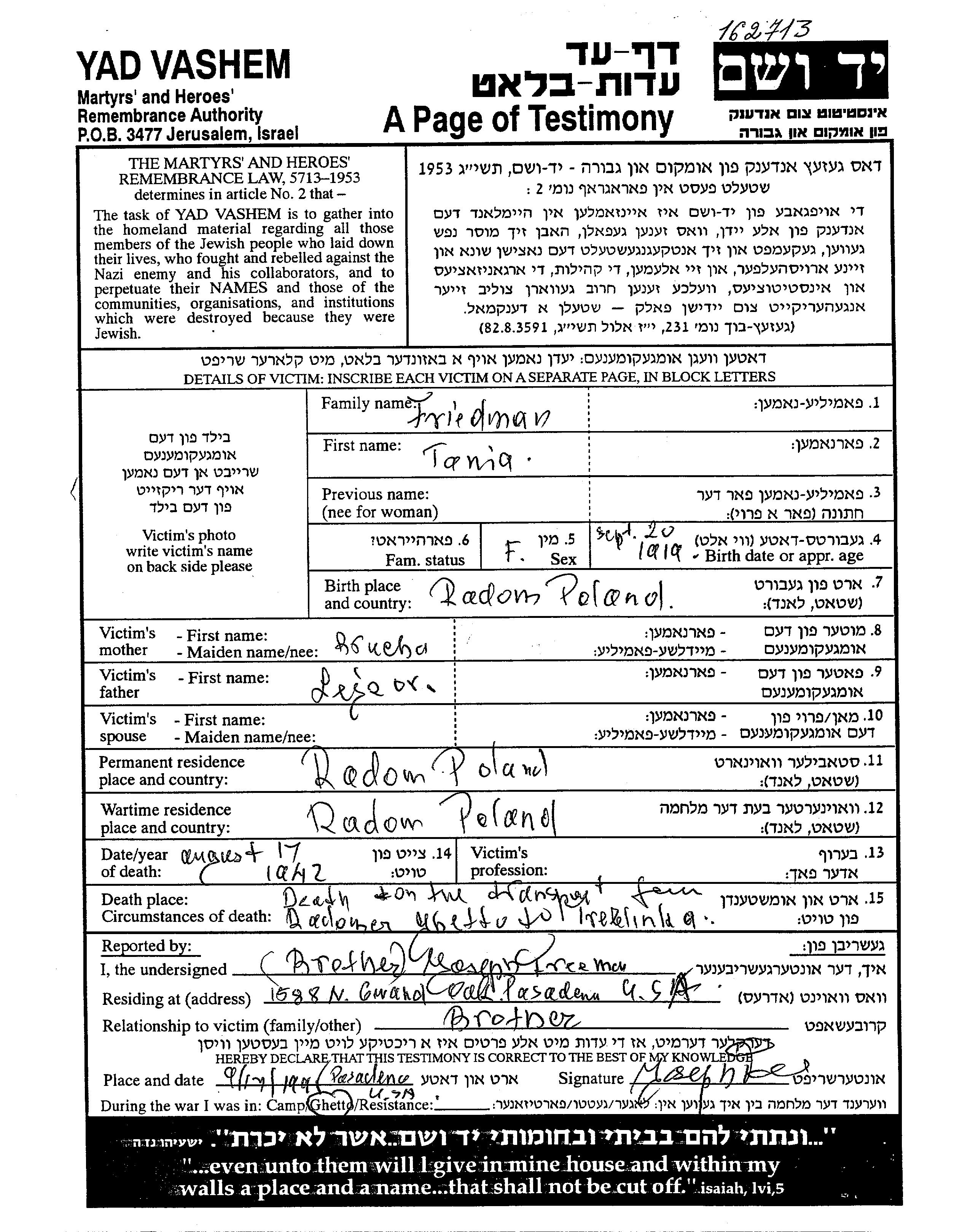 Таня Фридман, место рождения: Радом, Польша. Отец: Лейзор, mать:Бруха, девичья фамилия Гутман. Холост / не замужем. Место жительства до войны: Радом, Польша. Место во время войны: Радом, Польша.