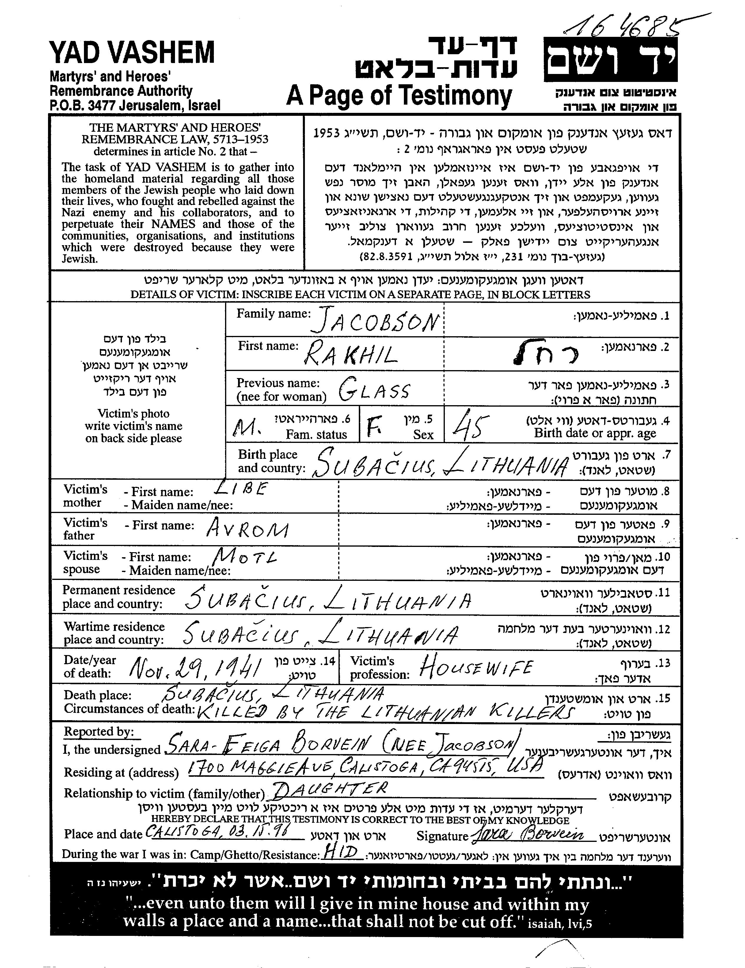 Рахиль Якобсон, девичья фамилия Глас, место рождения: Субачюс, Литва. Отец: Авром, mать:Либа. Домохозяйка. Женат / замужем. Место жительства до войны: Субачюс, Литва. Место во время войны: Субачюс, Литва.