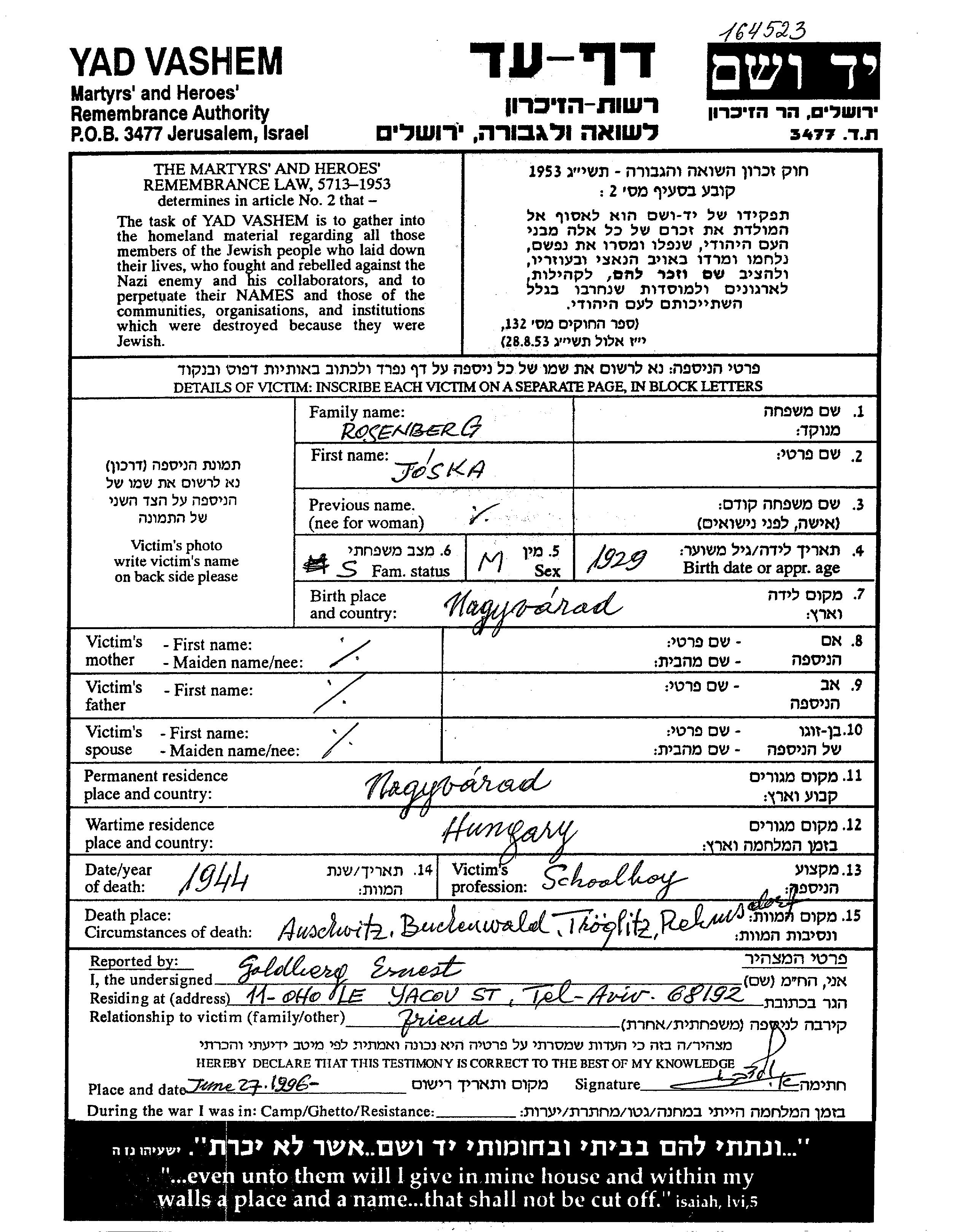 Йоска Розенберг, место рождения: Надьварад, Румыния. Ученик / ученица. Ребенок. Место жительства до войны: Надьварад, Румыния. Место во время войны: Венгрия.