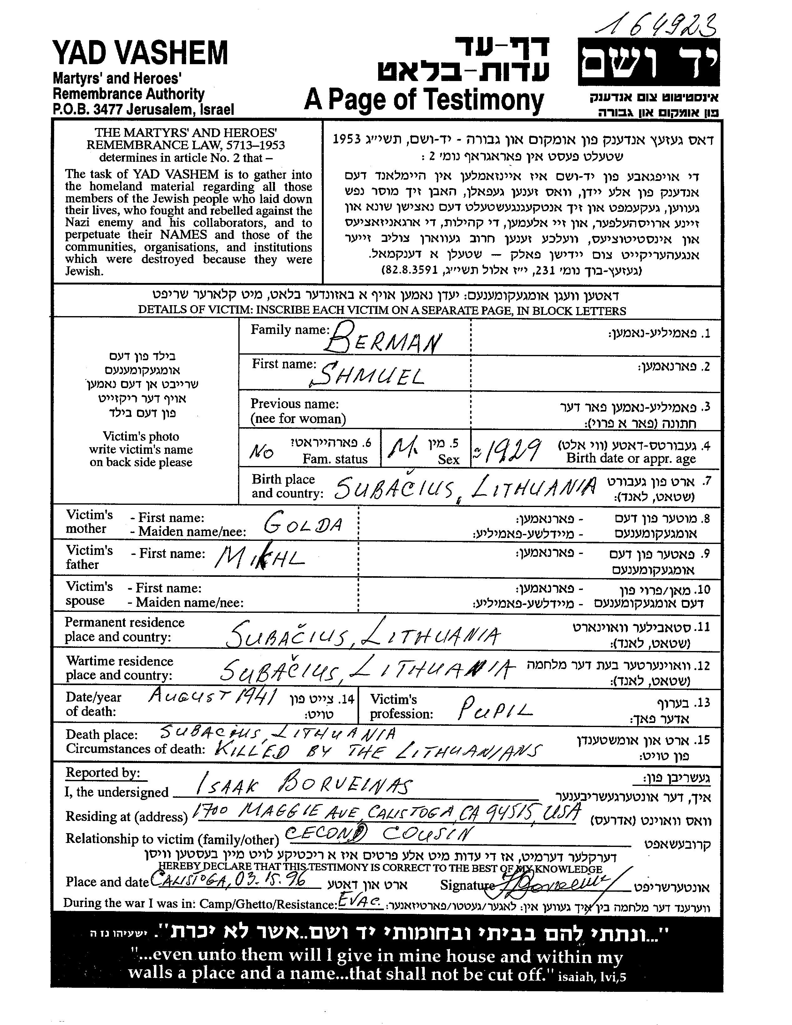 Берман Шмуэль 1929 Субачюс, Литва Лист свидетельских показаний