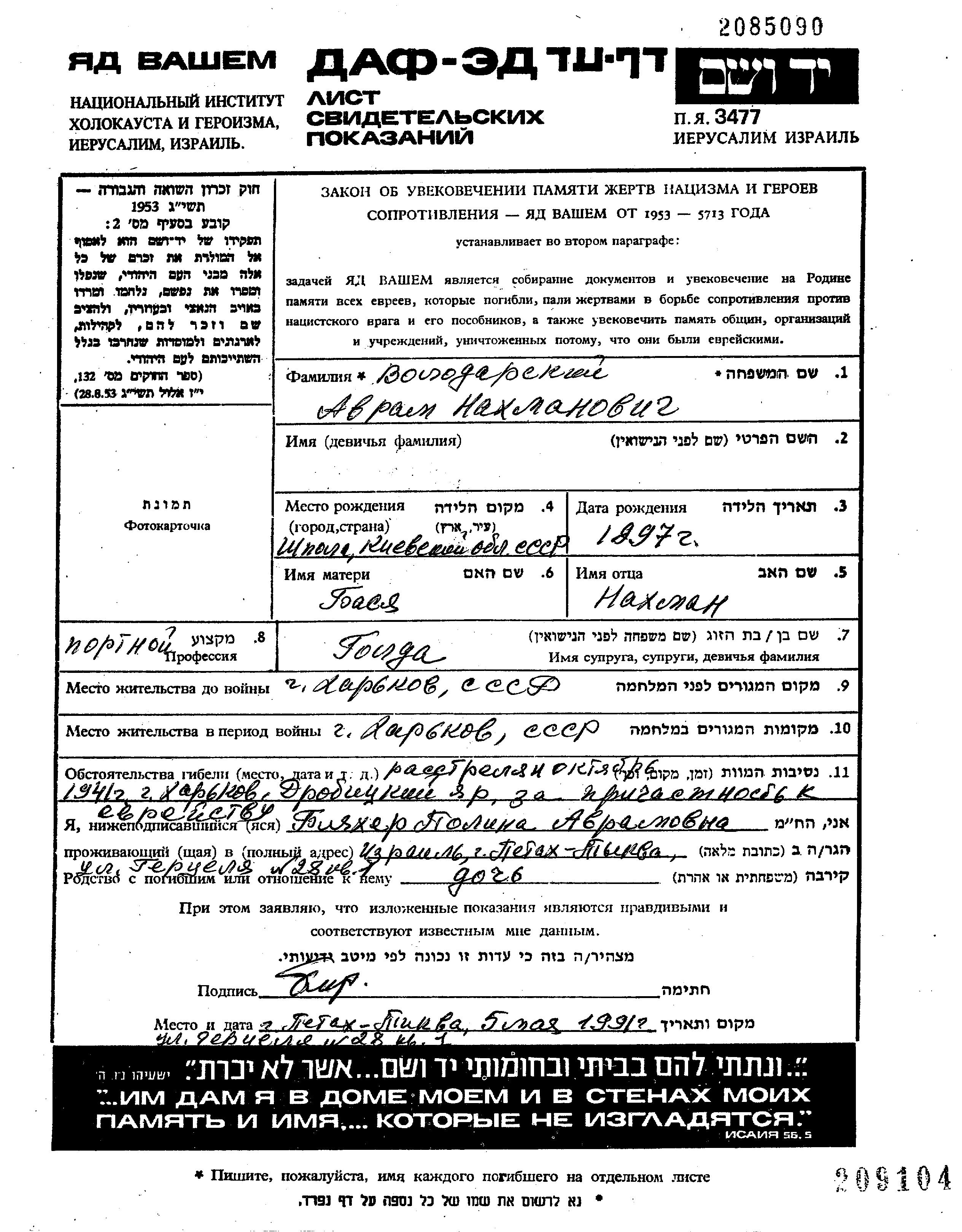 Володарский Аврам Харьков, Украина (СССР) Лист свидетельских показаний