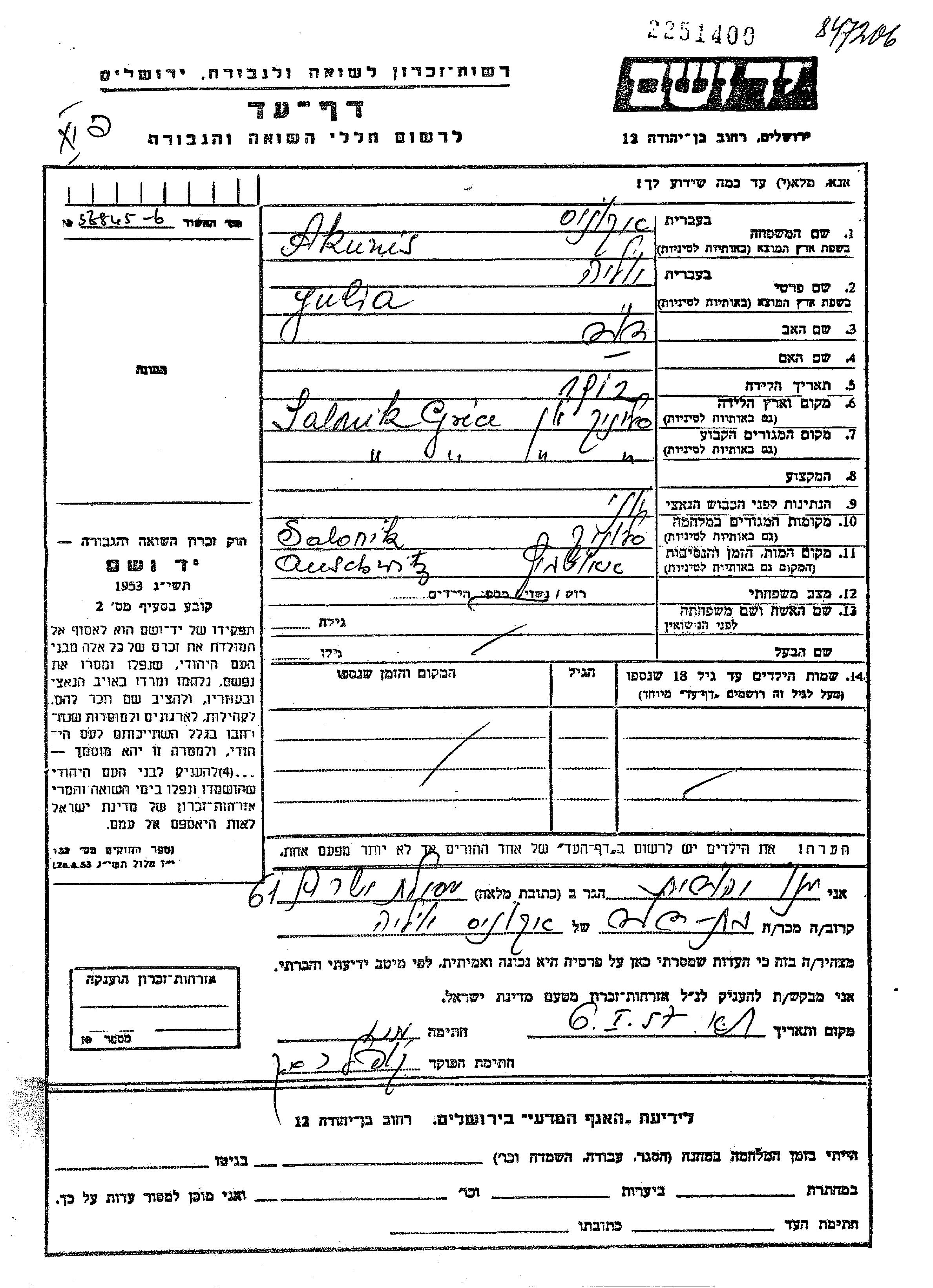 Юлия Акунис, место рождения: Салоники, Греция. Отец: Давид. Холост / не замужем. Место жительства до войны: Салоники, Греция. Место во время войны: Салоники, Греция.