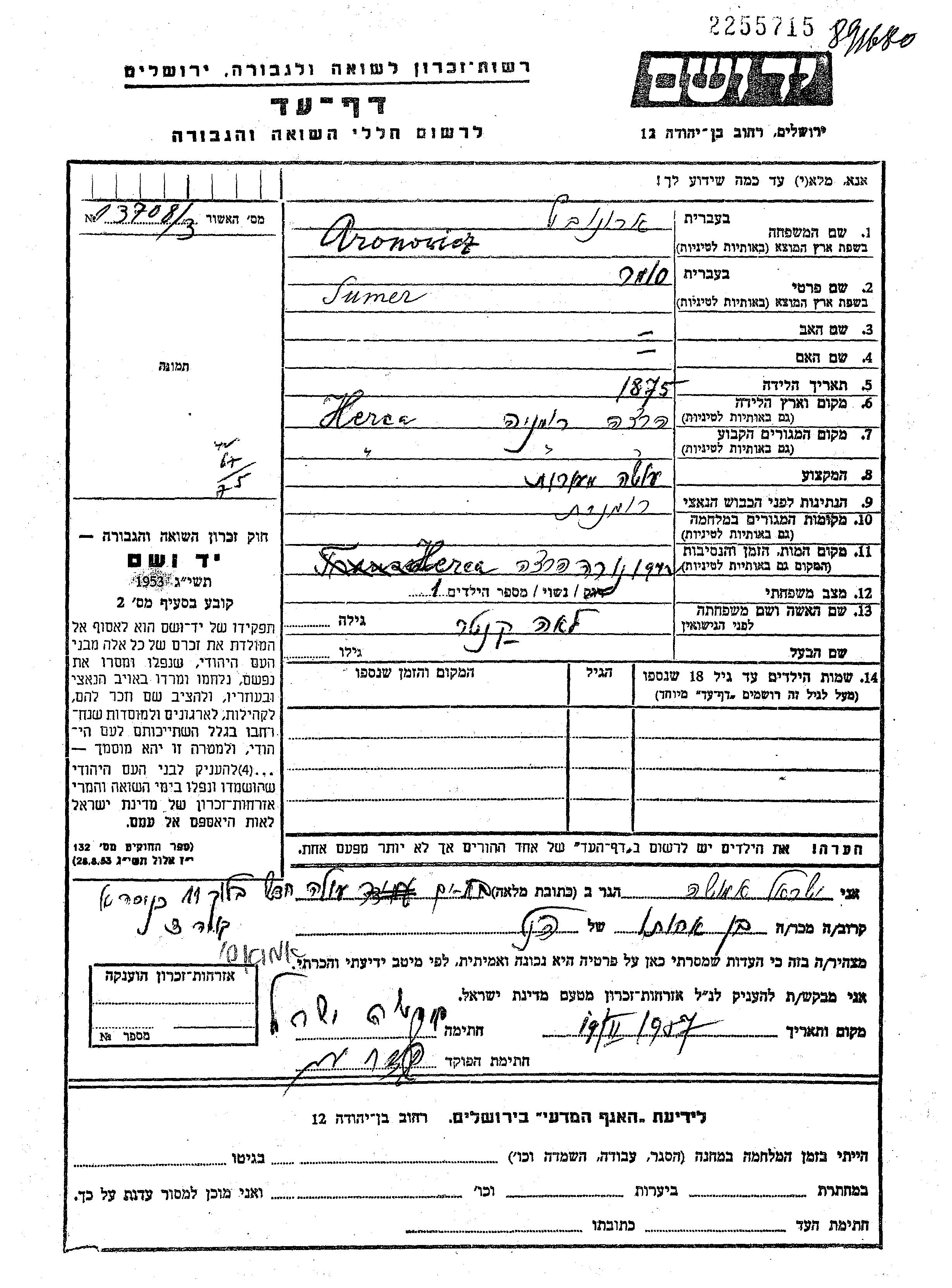 Аронович Сумер 1875 Херца, Румыния Лист свидетельских показаний