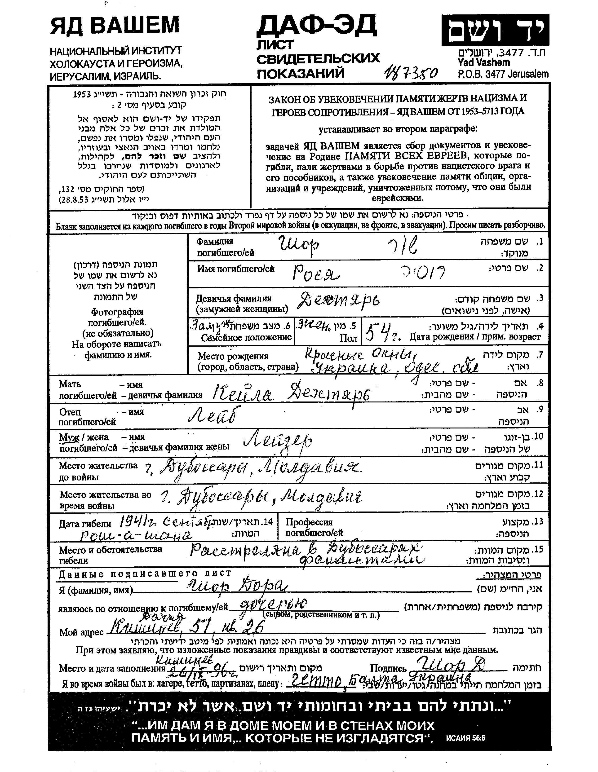 Шор Рося 1887 Дубоссары, Украина (СССР) Лист свидетельских показаний