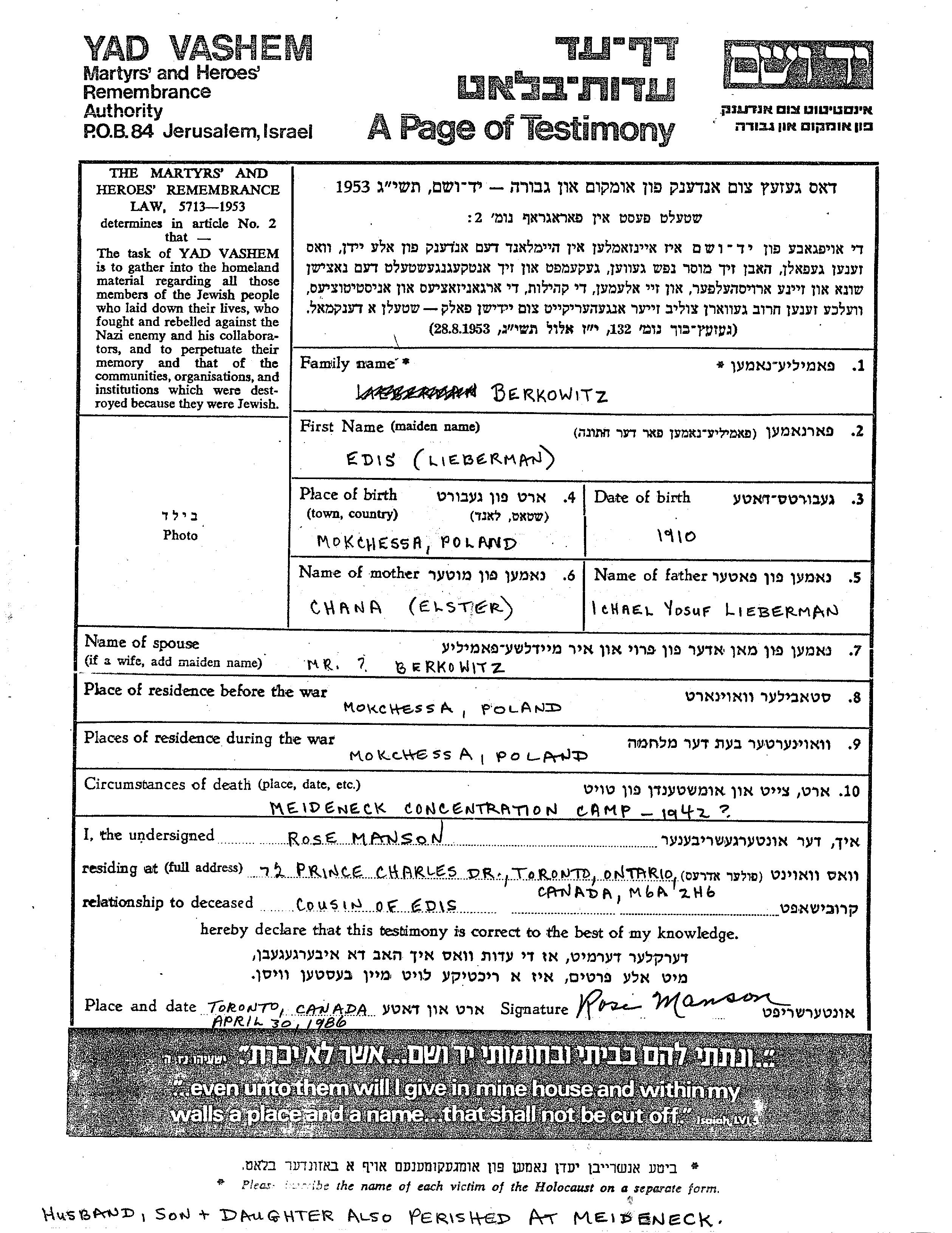 Эдис Берковиц, девичья фамилия Либерман, место рождения: Mokrzesza, Польша. Отец: Иехиэль Иосеф, mать:Хана. Женат / замужем. Место жительства до войны: Mokrzesza, Польша. Место во время войны: Mokrzesza, Польша.