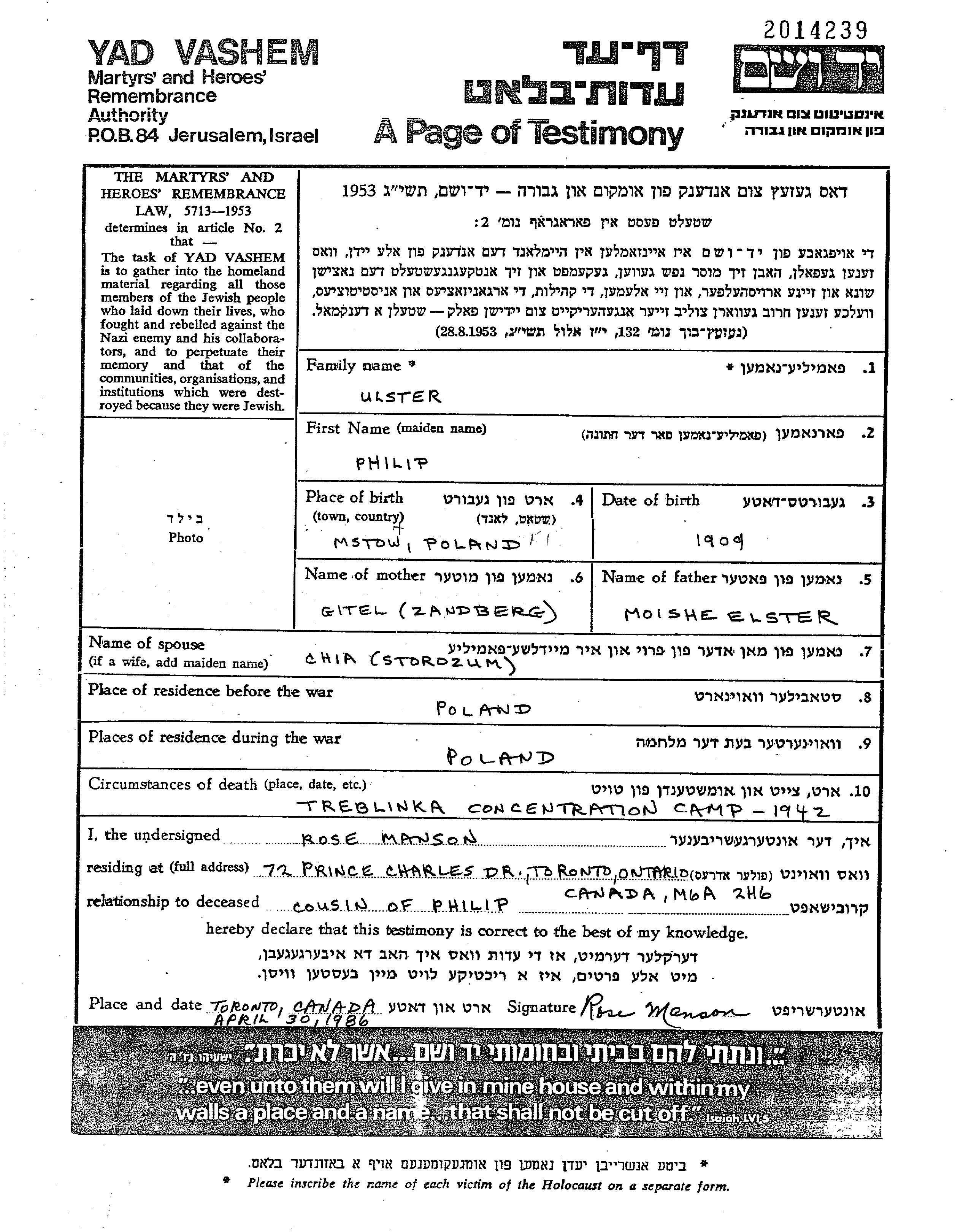 Филип Ульстер, место рождения: Мстов, Польша. Отец: Мойше, mать:Гитель, девичья фамилия Зандберг. Женат / замужем. Место жительства до войны: Польша. Место во время войны: Польша.