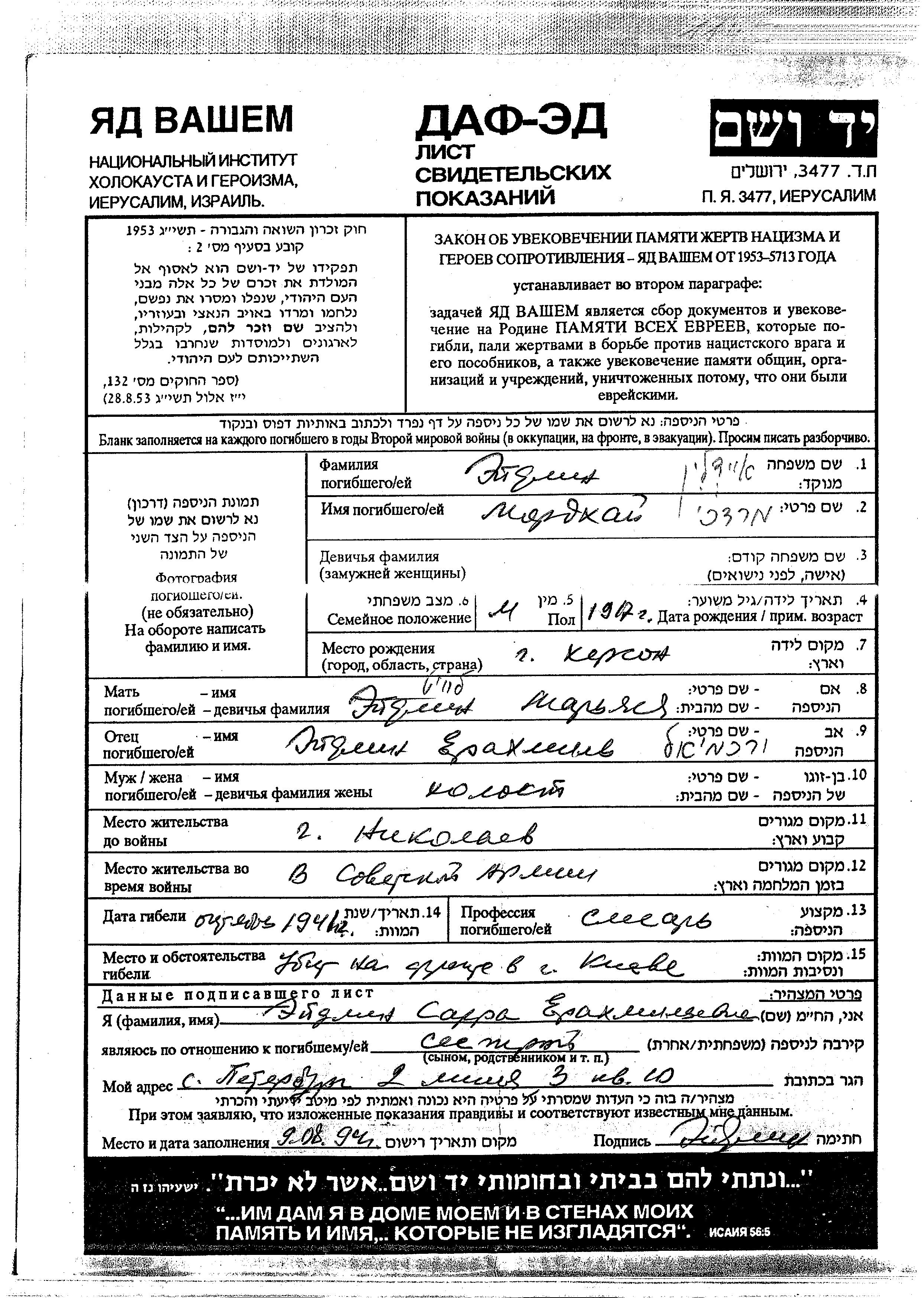 Мордхай Эйдлин, место рождения: Херсон, Украина (СССР). Отец: Иерахмиэль, mать:Марьяса. Слесарь. Холост / не замужем. Место жительства до войны: Николаев, Украина (СССР). Место во время войны: Вооруженные силы Советского Союза. Мордхай погиб на военной службе. место смерти: Киев, Украина (СССР) в 10/1941.