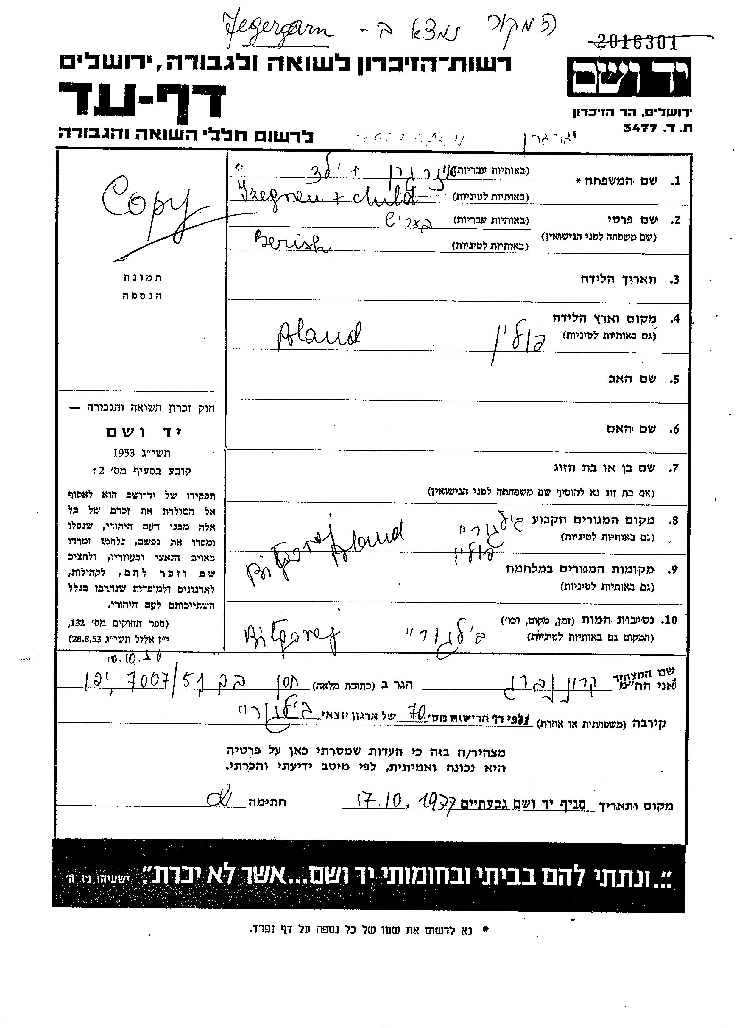 Бериш Изегрен, место рождения: Польша. Место жительства до войны: Билгорай, Польша.