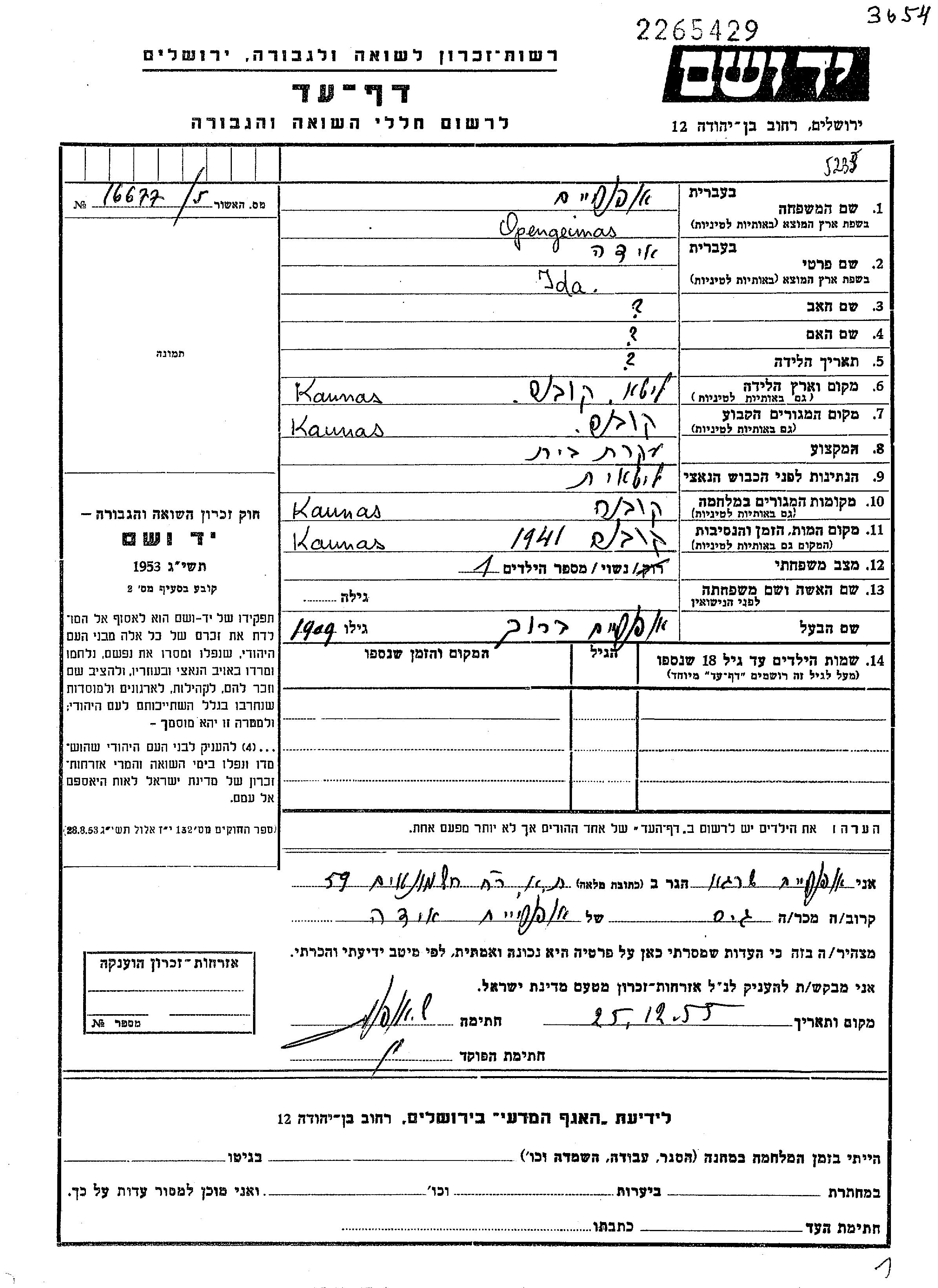 Ида Опенгеймас, место рождения: Каунас, Литва. Домохозяйка. Женат / замужем. Место жительства до войны: Каунас, Литва. Место во время войны: Каунас, Литва.