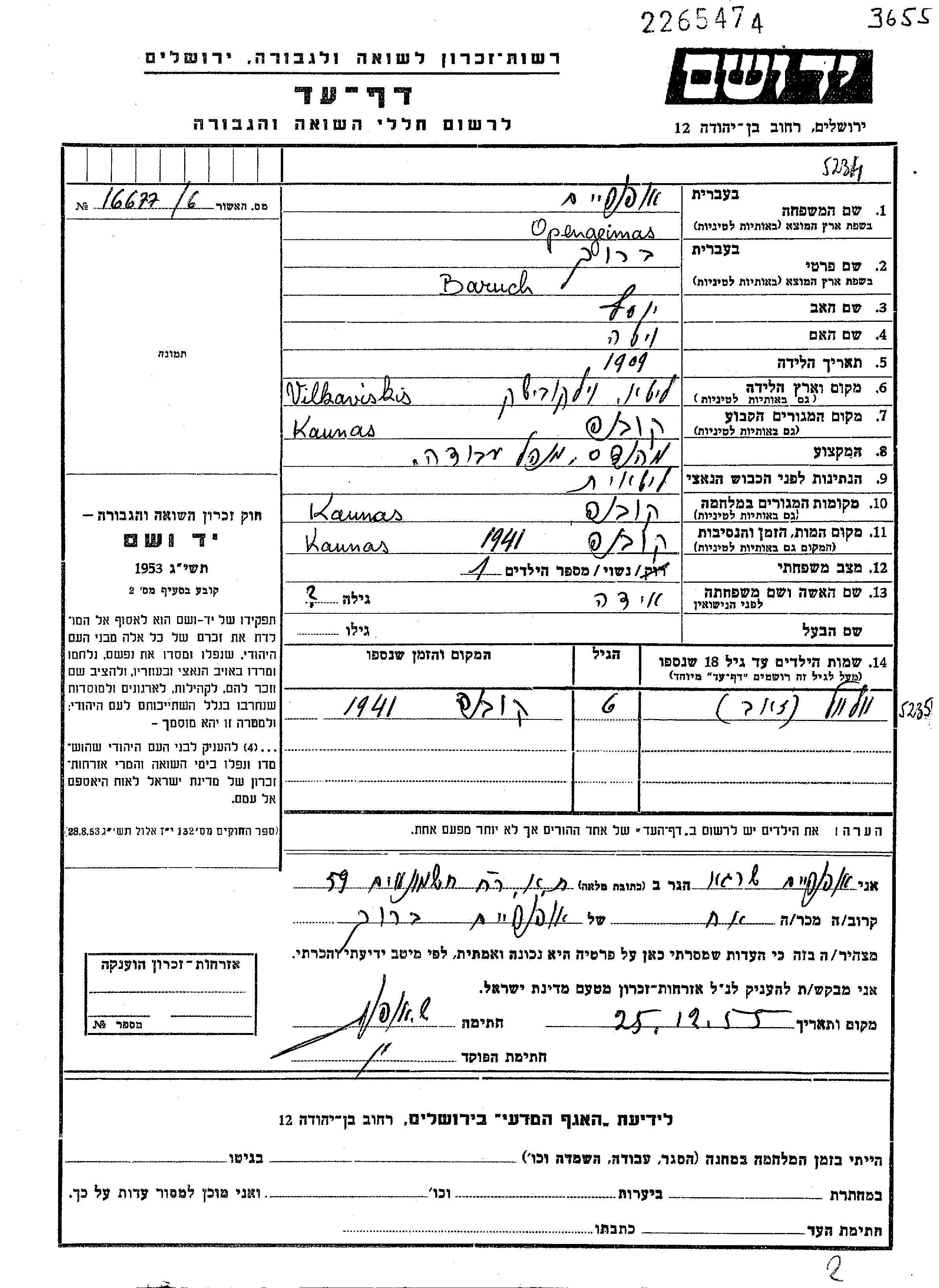 Опенгеймас Барух 1909 Каунас, Литва Лист свидетельских показаний
