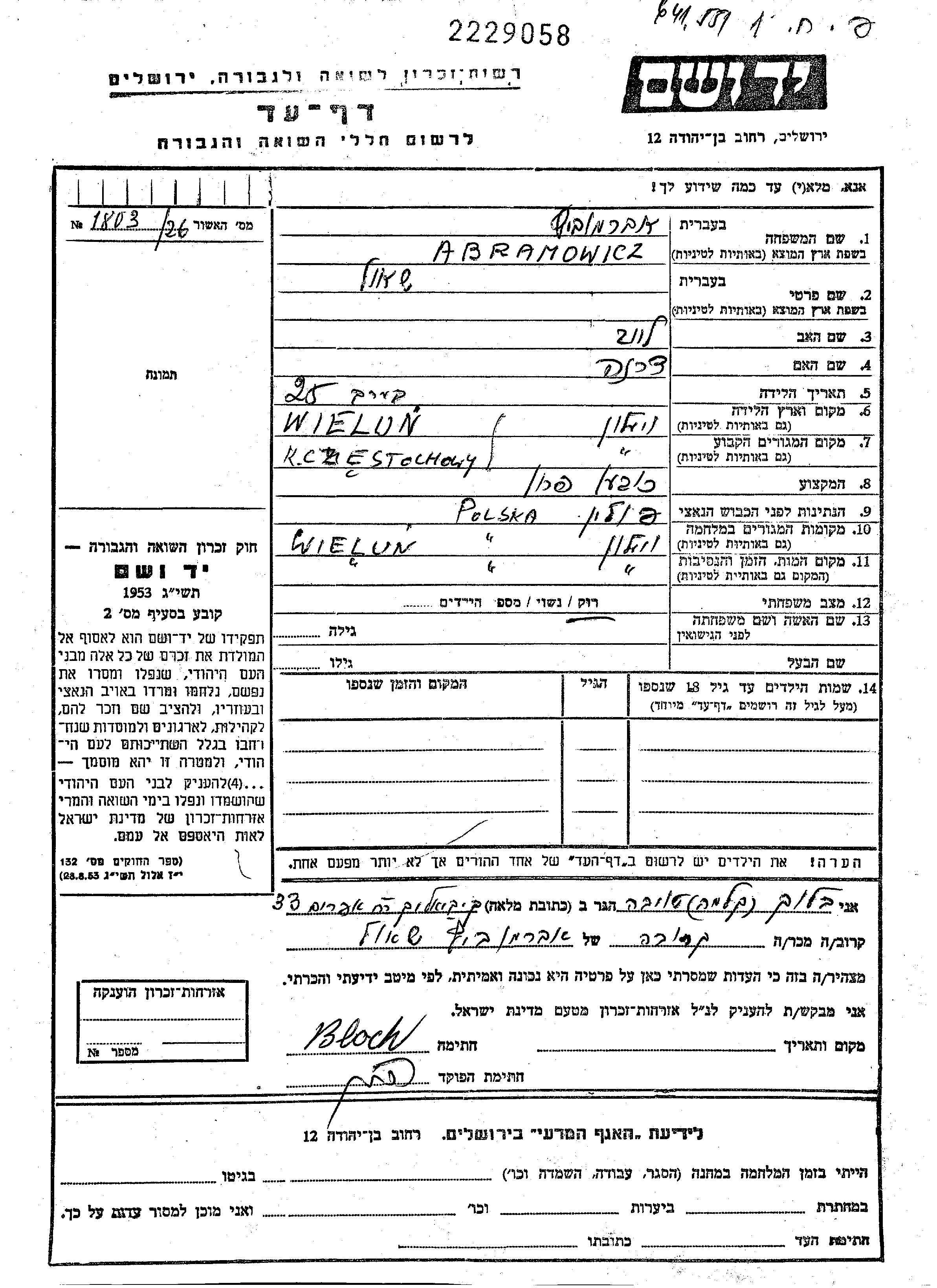 Шауль Абрамович, место рождения: Велюнь, Польша. Отец: Лейб, mать:Чарна, девичья фамилия Кальма. Шляпник / модистка. Холост / не замужем. Место жительства до войны: Велюнь, Польша. Место во время войны: Велюнь, Польша.
