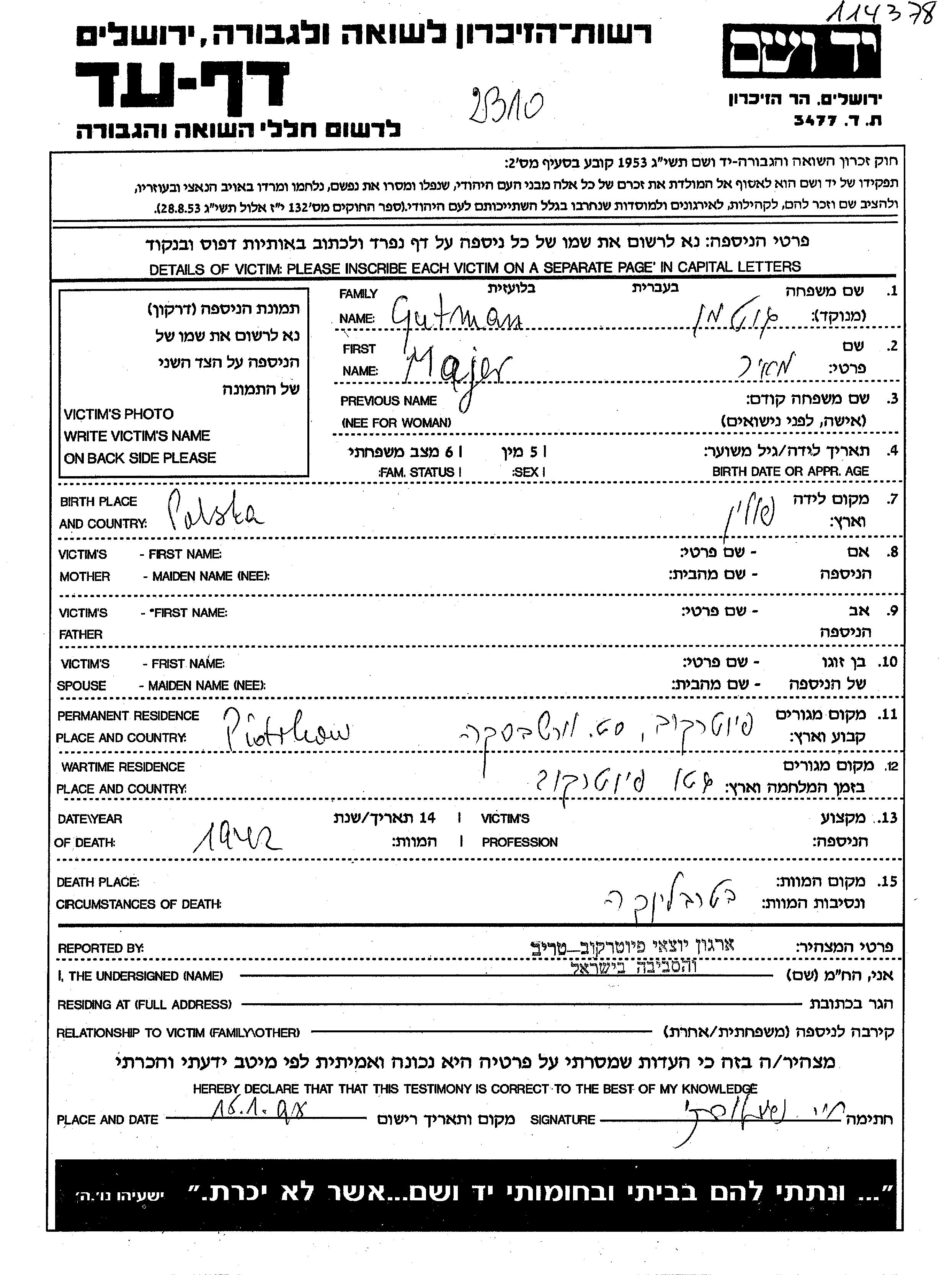 Маер Гутман, место рождения: Польша. Место жительства до войны: Пётркув, Польша. Место во время войны: Пётркув, Польша. Маер уничтожен в период Шоа. место смерти: Треблинка, Польша в 1942.