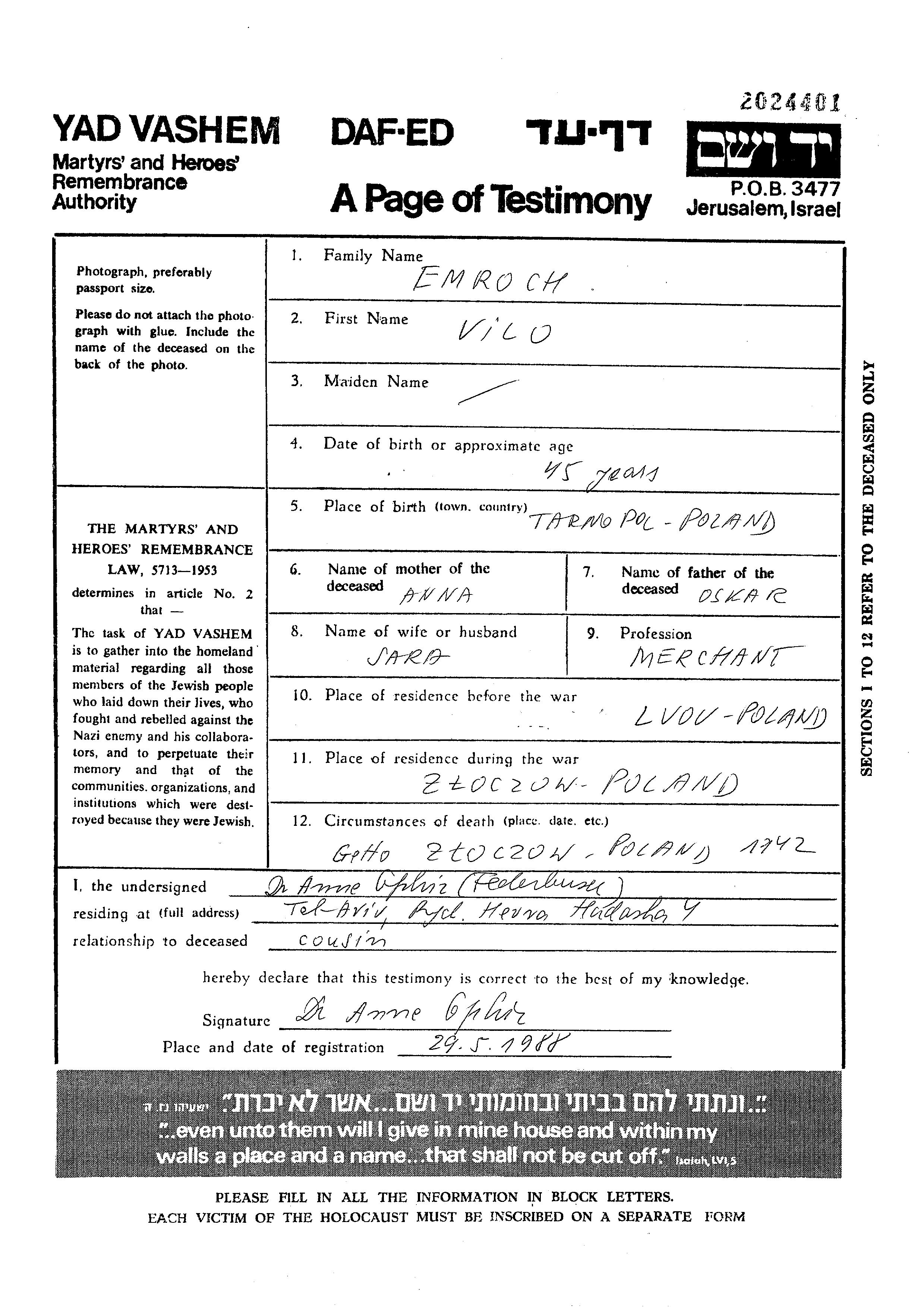 Вило Эмрох, место рождения: Тарнополь, Польша. Отец: Оскар, mать:Анна. Торговец / торговка. Женат / замужем. Место жительства до войны: Львов, Польша. Место во время войны: Злочов, Польша.