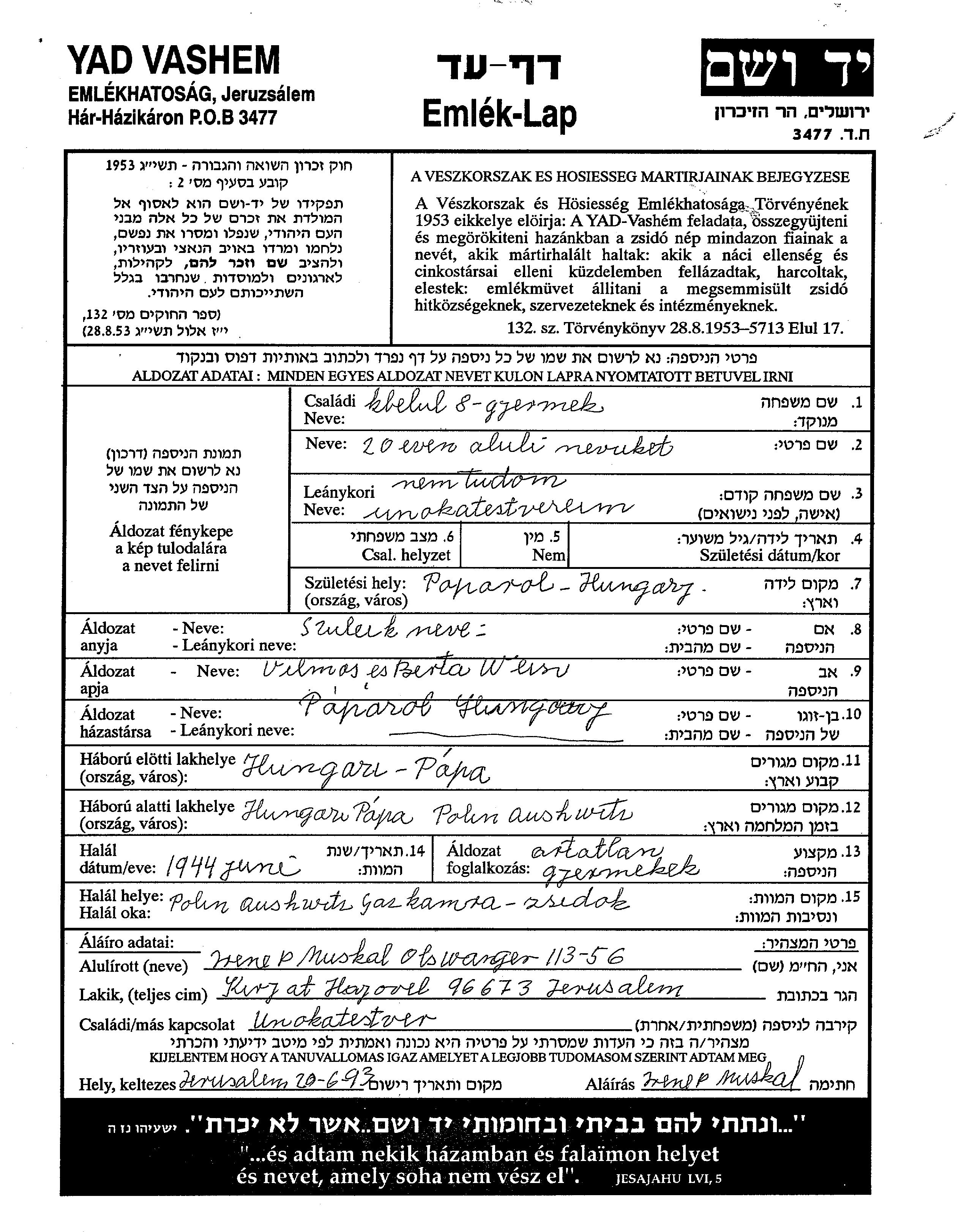 Имя неизвестно Фамилия неизвестна родился/родилась, место рождения: Папа, Венгрия. Отец: Вильмош, mать:Берта. Ребенок. Место жительства до войны: Папа, Венгрия. Место во время войны: Папа, Венгрия.