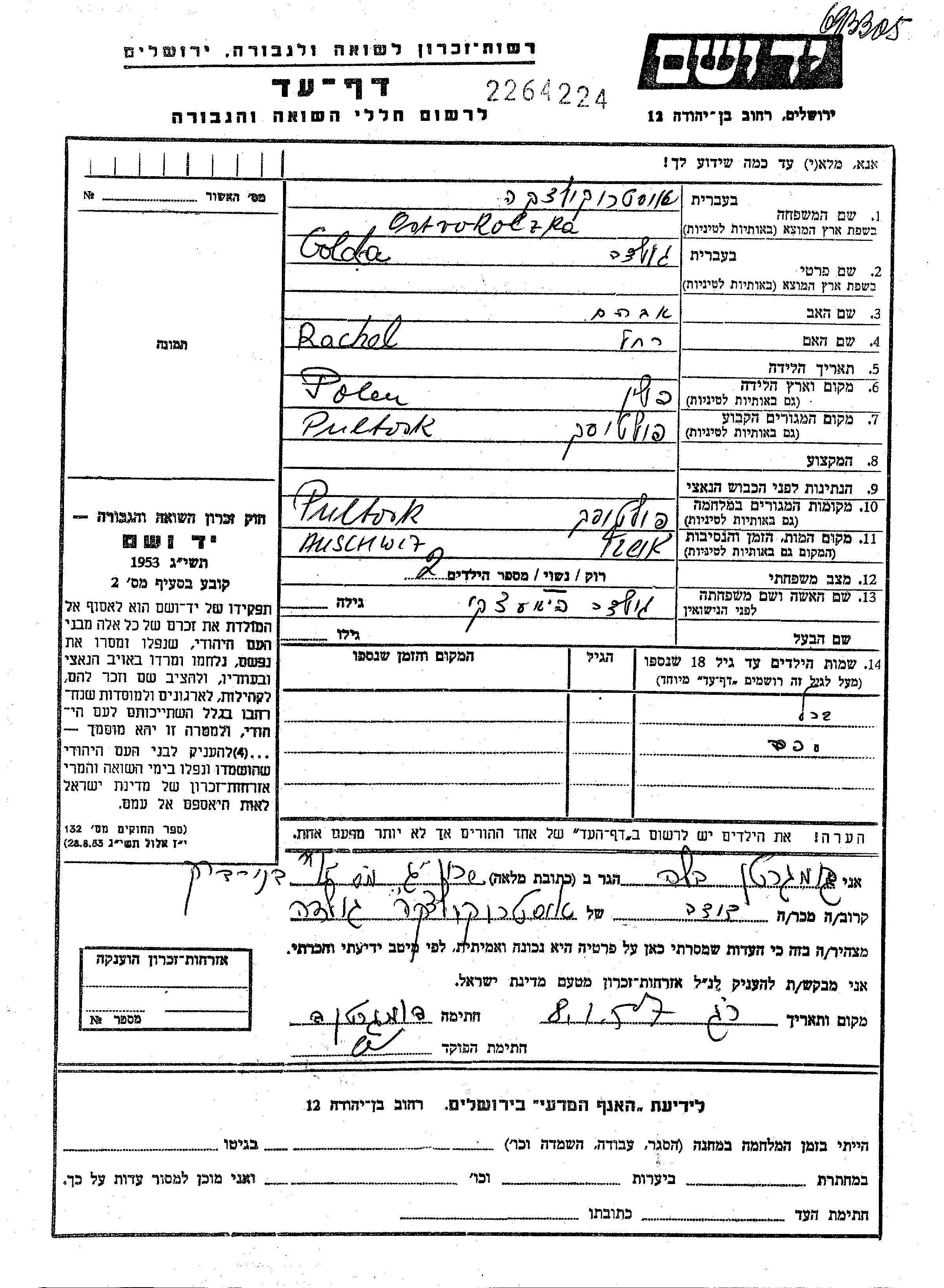 Голда Острокольцка, девичья фамилия Пиясецки, место рождения: Польша. Отец: Авраам, mать:Рахель. Женат / замужем. Место жительства до войны: Пултуск, Польша. Место во время войны: Пултуск, Польша.