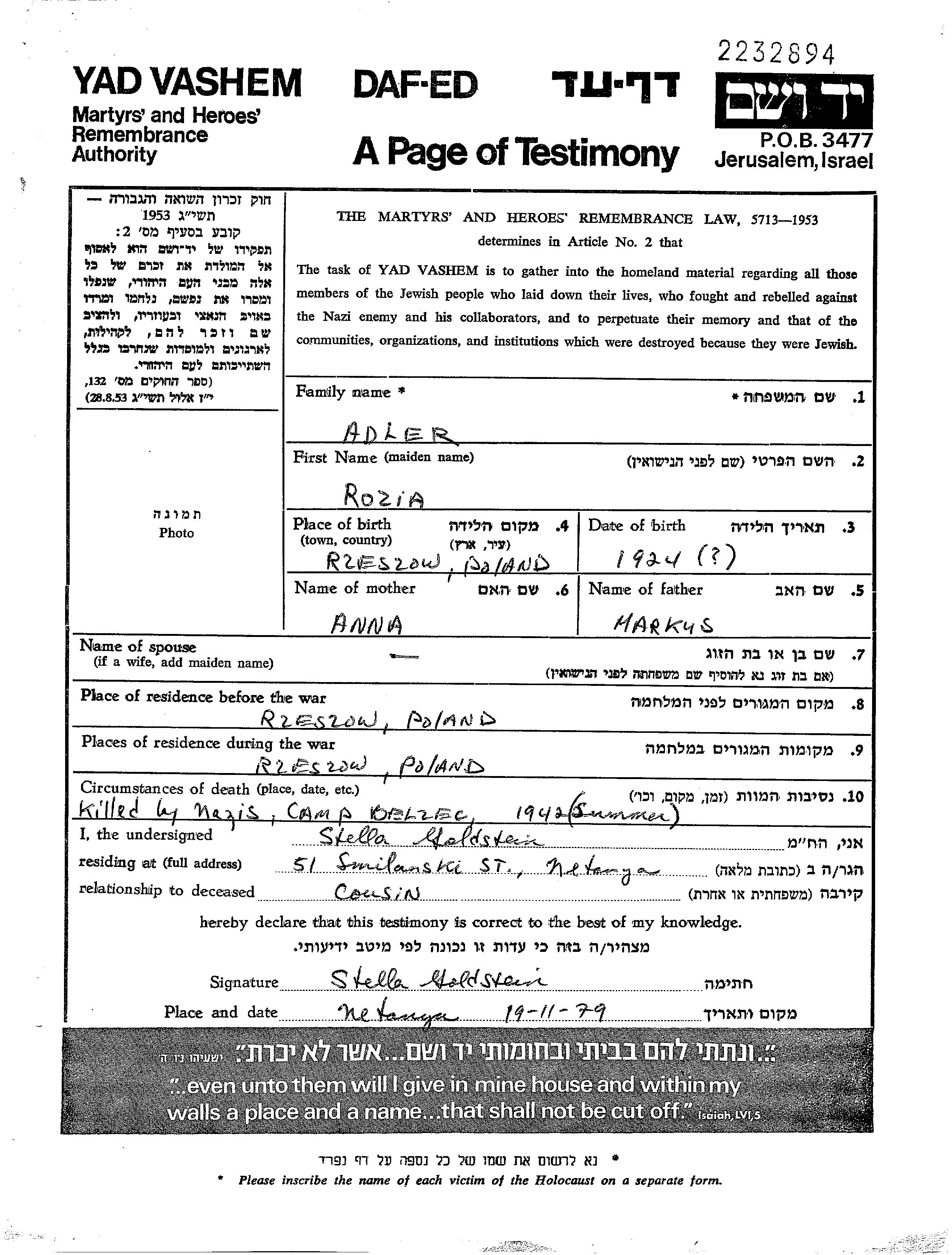 Рожа Адлер, место рождения: Жешув, Польша. Отец: Маркус, mать:Анна, девичья фамилия Люфт. Холост / не замужем. Место жительства до войны: Жешув, Польша. Место во время войны: Жешув, Польша.
