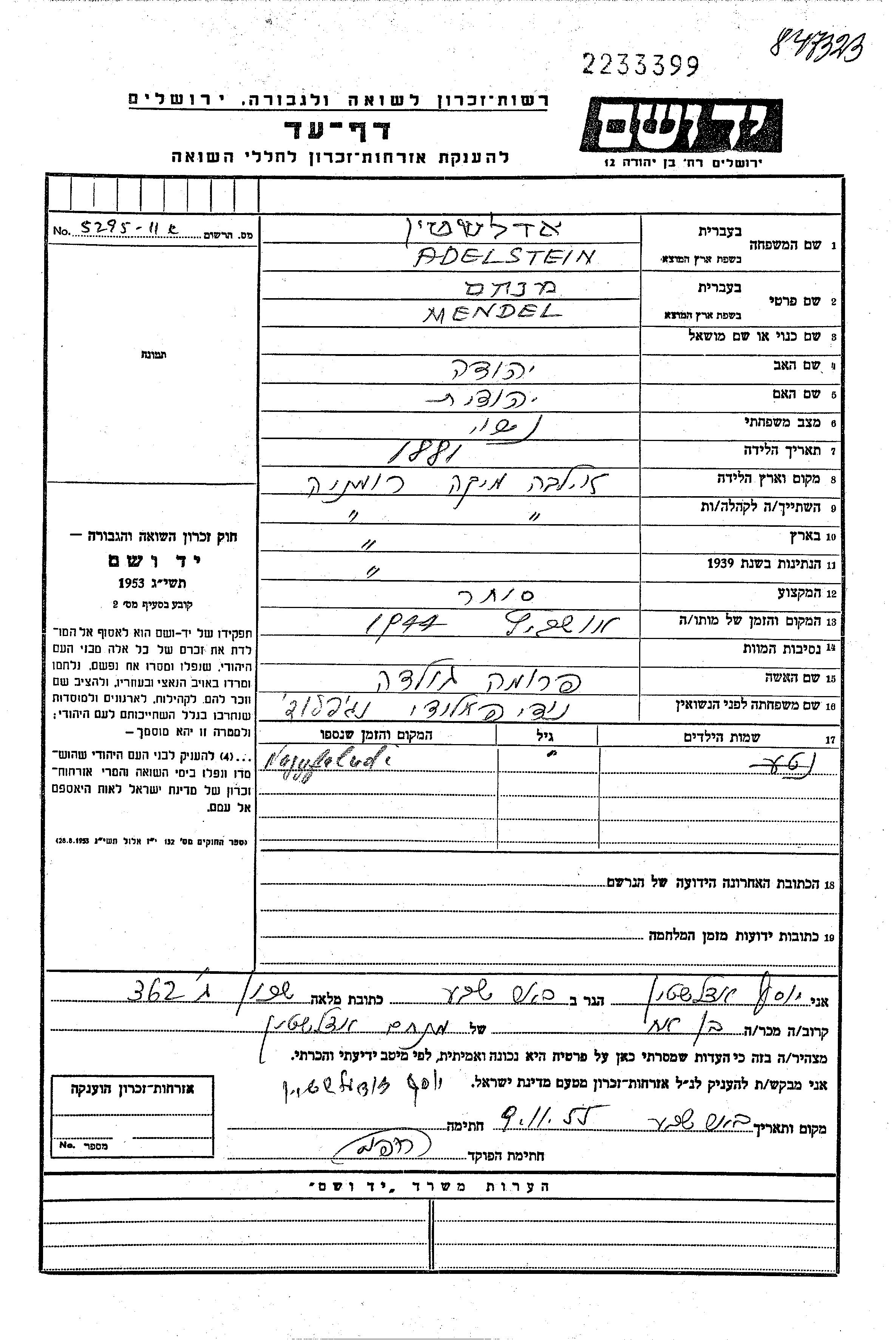 Адельштайн Мендель Менахем 1881 Илва-Микэ, Румыния Лист свидетельских показаний