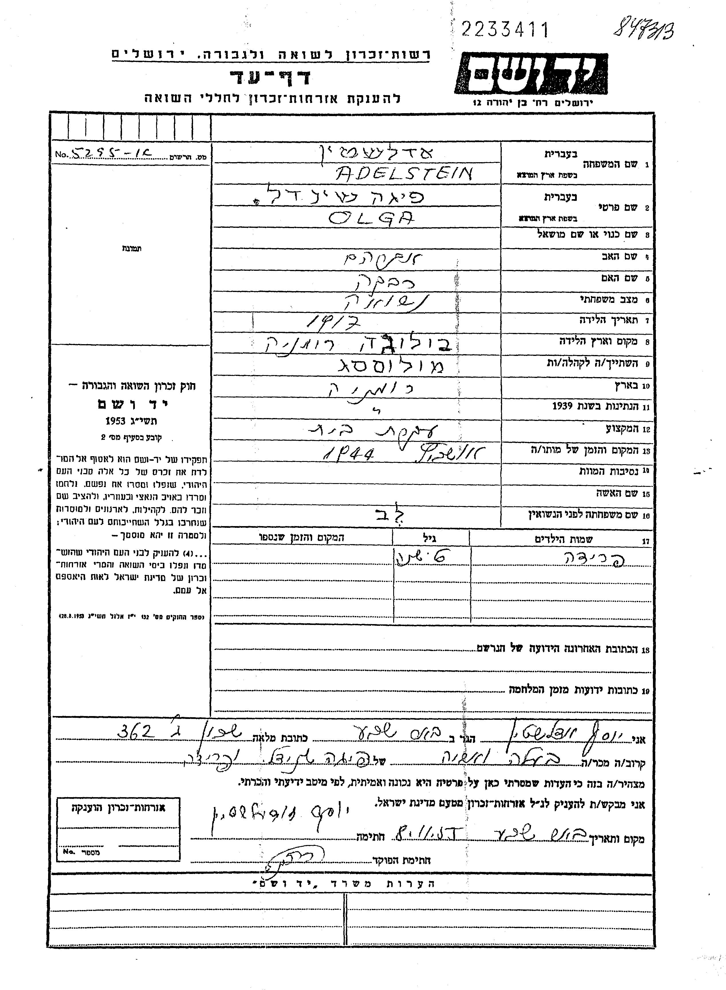 Адельштайн Фрида 1938 Маломсег, Румыния Лист свидетельских показаний