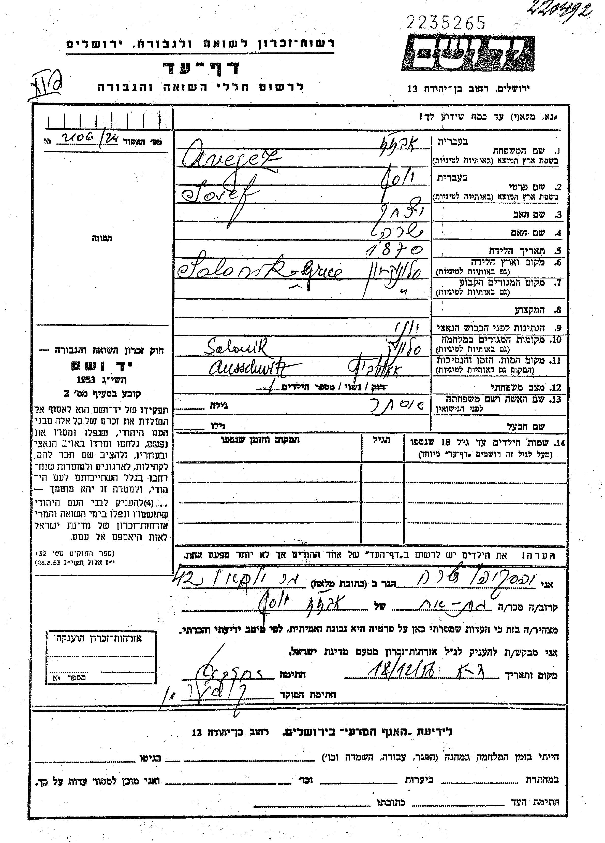 Йосеф Авежес, место рождения: Салоники, Греция. Отец: Ицхак, mать:Сара. Женат / замужем. Место жительства до войны: Салоники, Греция. Место во время войны: Салоники, Греция.