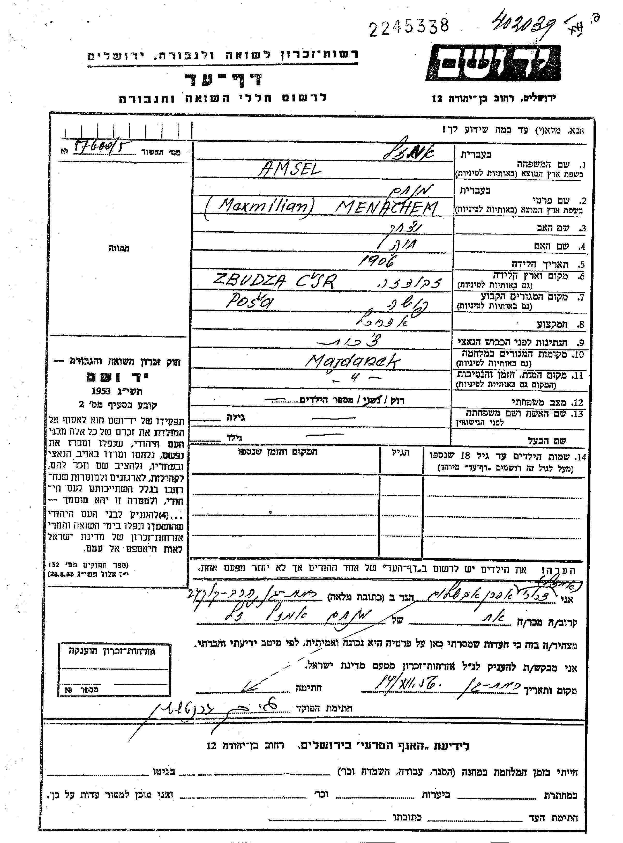 Менахем Максмилиан Амсел, место рождения: Збудза, Чехословакия. Отец: Ицхак, mать:Хая. Архитектор. Холост / не замужем. Место жительства до войны: Поша, Чехословакия.