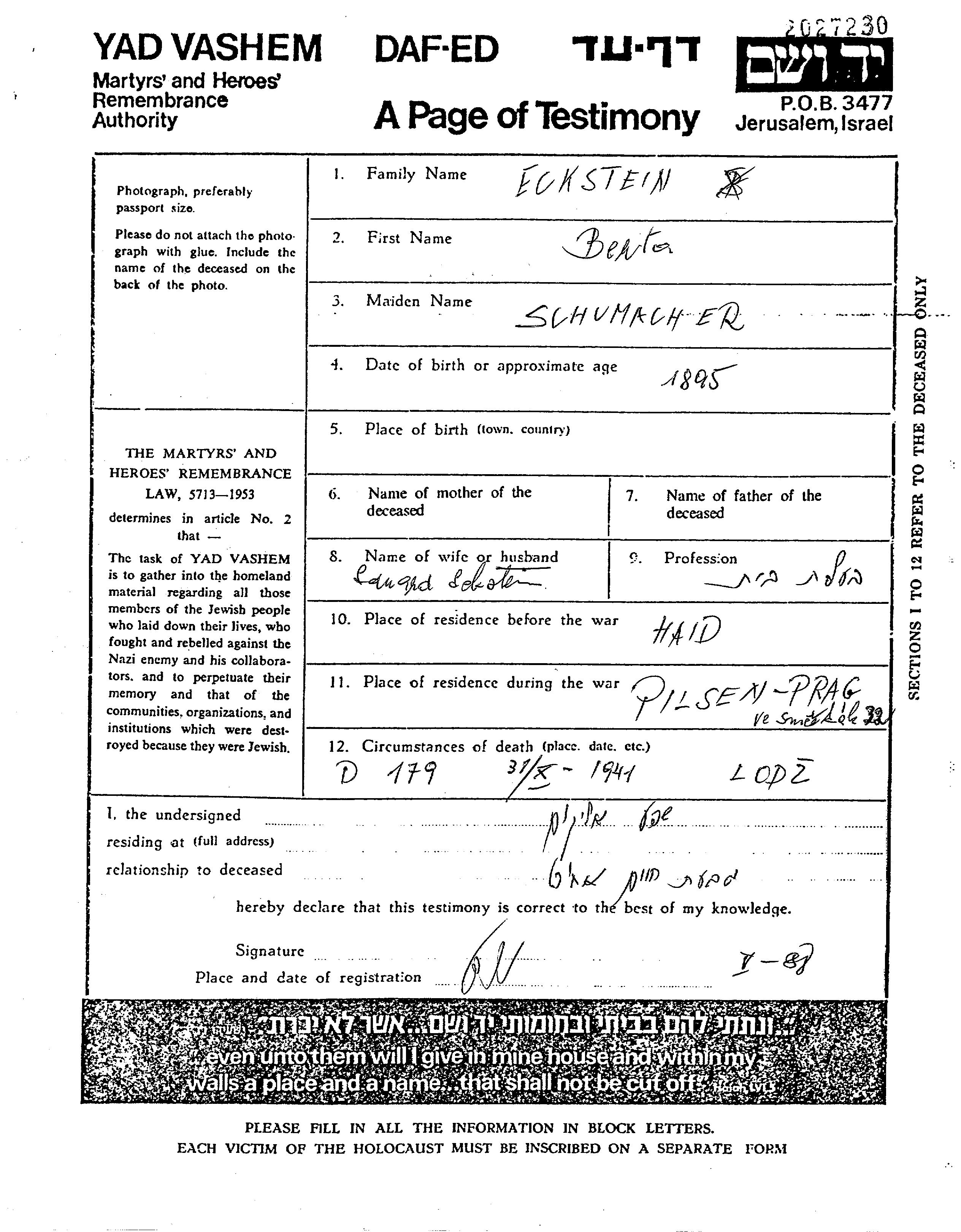 Берта Экштайн, девичья фамилия Шумахер. Домохозяйка. Женат / замужем. Место жительства до войны: Гаид, Чехословакия. Место во время войны: Прага, Чехословакия.