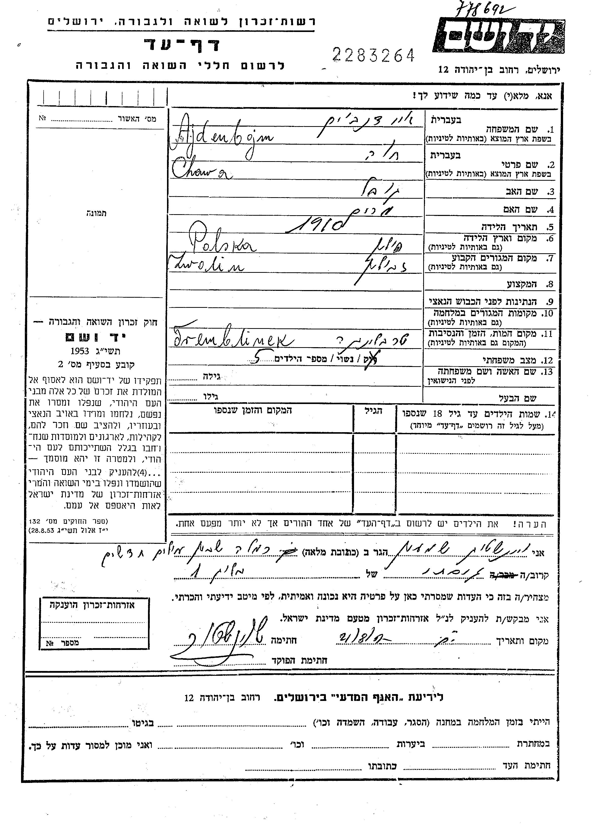 Хава Айденбойм, место рождения: Польша. Отец: Ковель, mать:Мирьям. Женат / замужем. Место жительства до войны: Зволин, Польша.