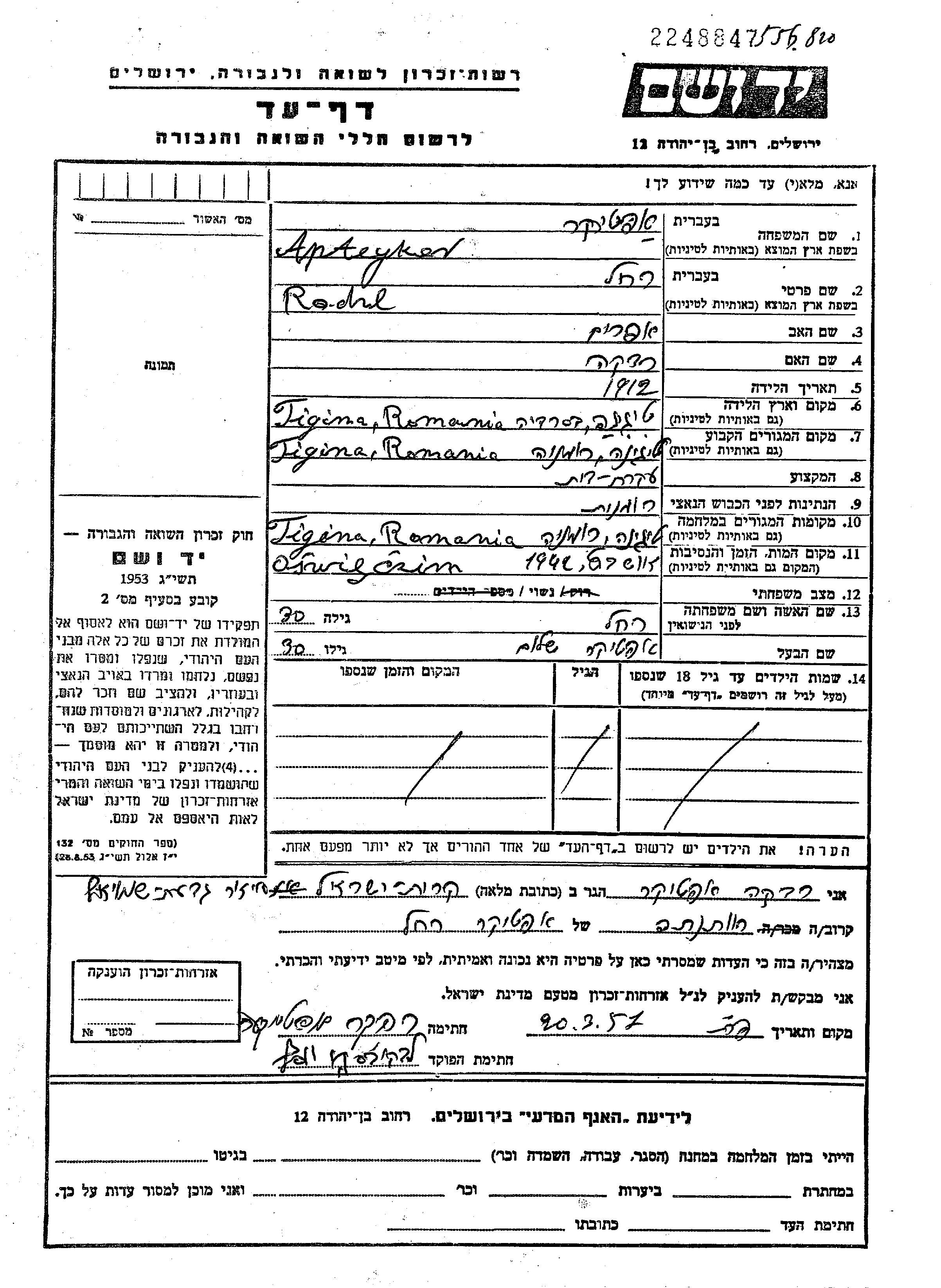 Рохл Аптейкер, место рождения: Тигина, Румыния. Отец: Эфраим, mать:Ривка. Домохозяйка. Женат / замужем. Место жительства до войны: Тигина, Румыния. Место во время войны: Тигина, Румыния.